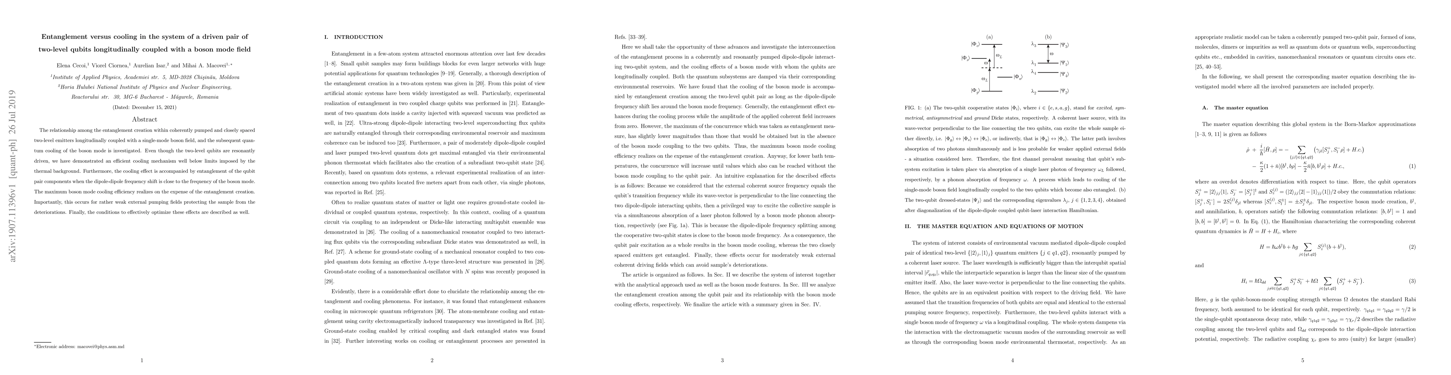 The relationship among the entanglement creation within coherently pumped and closely spaced two-level emitters longitudinally coupled with a single-mode boson field, and the subsequent quantum cooling of the boson mode is investigated. Even though the two-level qubits are resonantly driven, we have demonstrated an efficient cooling mechanism well below limits imposed by the thermal background. Furthermore, the cooling effect is accompanied by entanglement of the qubit pair components when the dipole-dipole frequency shift is close to the frequency of the boson mode. The maximum boson mode cooling efficiency realizes on the expense of the entanglement creation. Importantly, this occurs for rather weak external pumping fields protecting the sample from the deteriorations. Finally, the conditions to effectively optimize these effects are described as well.