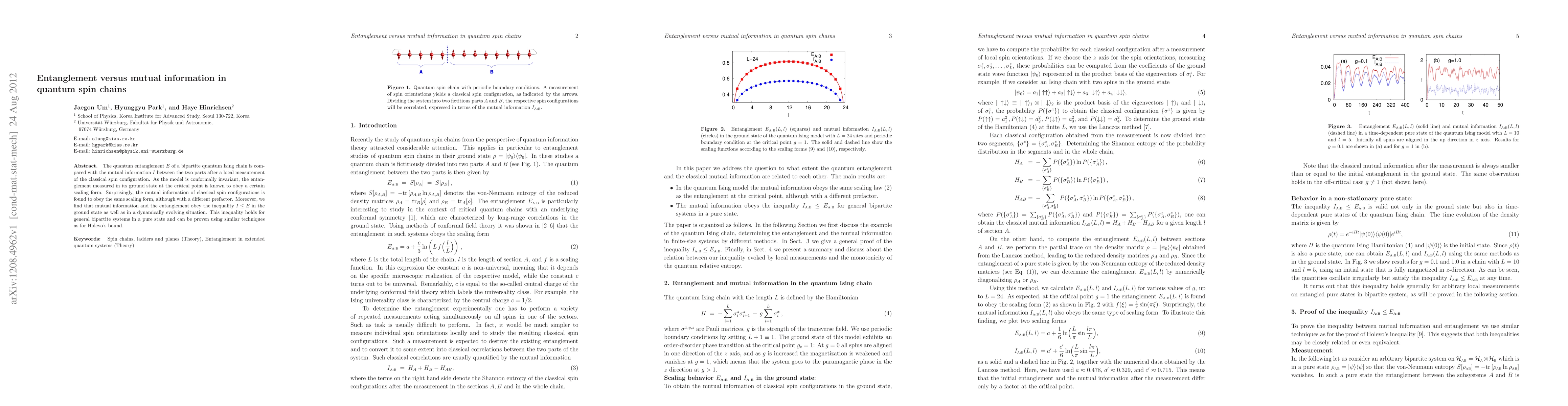 The paper presents a proof of the inequality $I_{AB} \leq E_{AB}$ for bipartite pure states and demonstrates that both entanglement and mutual information follow the same scaling form at the critical point of a quantum Ising chain, differing only by a prefactor.
