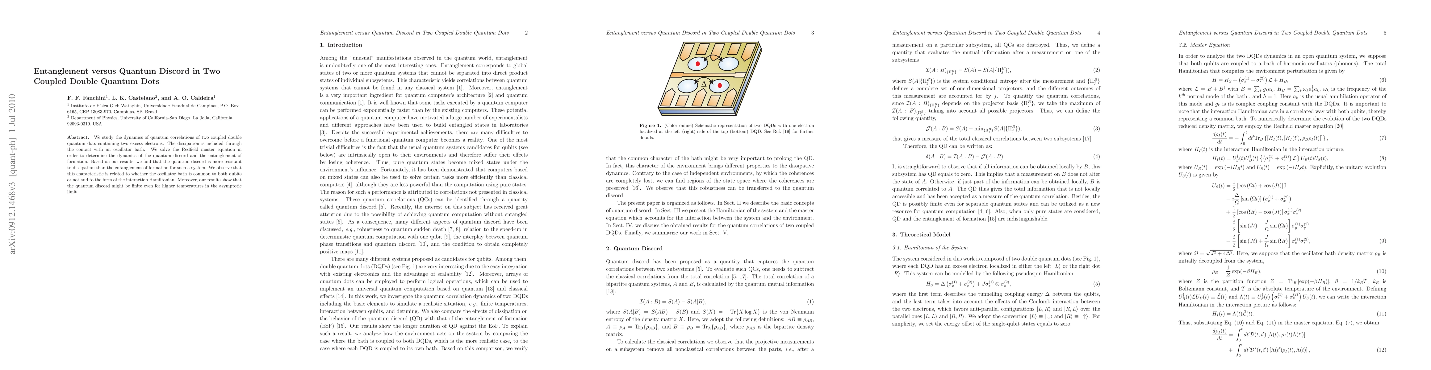 This study investigates the dynamics of quantum correlations in two coupled double quantum dots, finding that quantum discord is more resilient to dissipation than entanglement, especially when the oscillator bath is shared or the interaction Hamiltonian varies. Quantum discord remains finite even at higher temperatures in the long term.