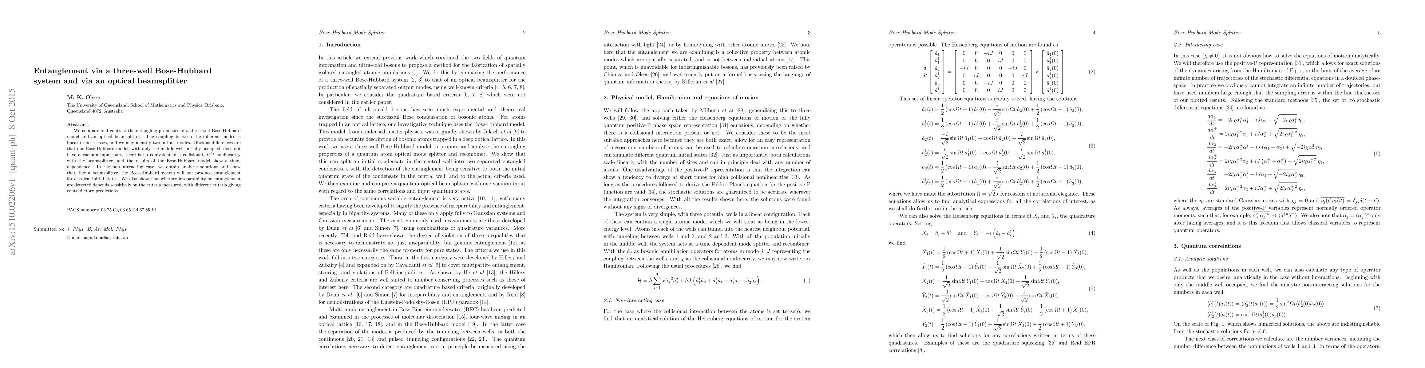 We compare and contrast the entangling properties of a three-well Bose-Hubbard model and an optical beamsplitter. The coupling between the different modes is linear in both cases, and we may identify two output modes. Obvious differences are that our Bose-Hubbard model, with only the middle well initially occupied, does not have a vacuum input port, there is no equivalent of a collisional, $\chi^{(3)}$ nonlinearity with the beamsplitter, and the results of the Bose-Hubbard model show a time-dependence. In the non-interacting case, we obtain analytic solutions and show that, like a beamsplitter, the Bose-Hubbard system will not produce entanglement for classical initial states. We also show that whether inseparability or entanglement are detected depends sensitively on the criteria measured, with different criteria giving contradictory predictions.
