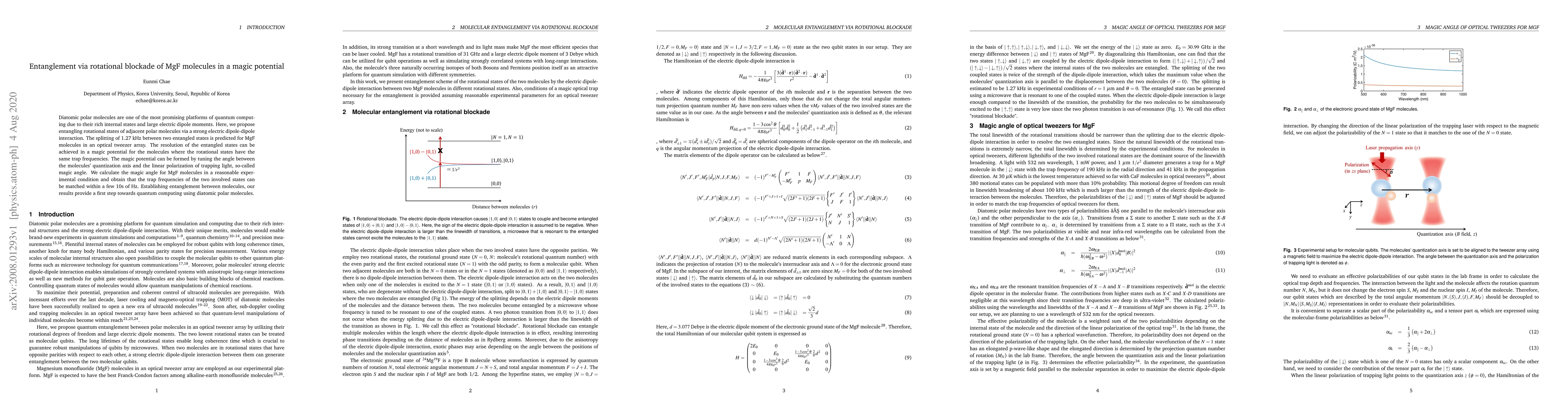 This paper proposes a method to entangle the rotational states of adjacent MgF molecules using strong electric dipole-dipole interactions in an optical tweezer array. The study predicts a 1.27 kHz splitting between entangled states and suggests using a "magic potential" formed by tuning the trapping light's polarization angle to achieve state resolution and match trap frequencies within a few tens of Hz.
