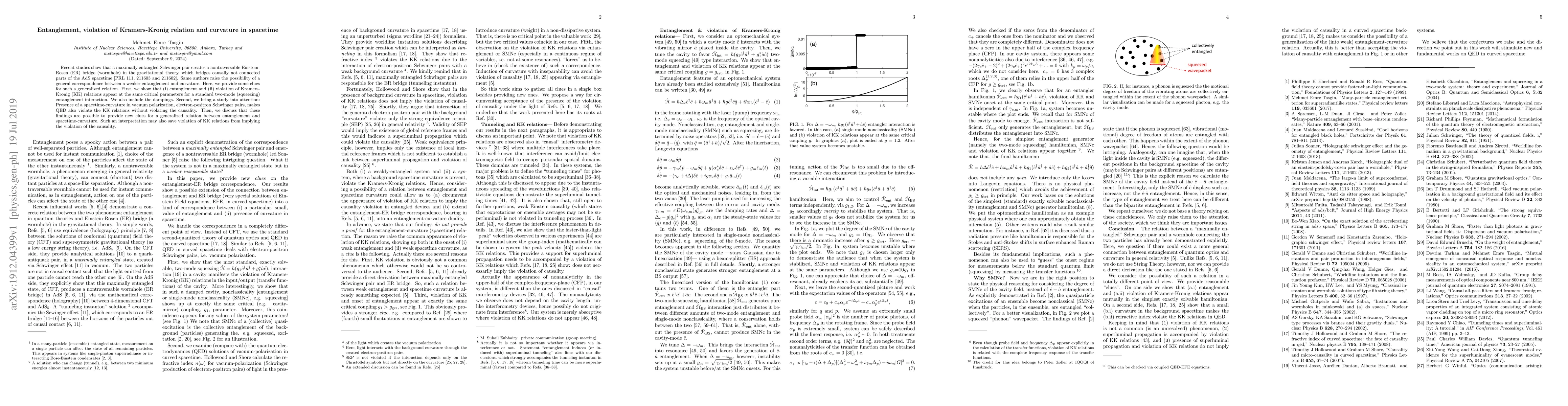 Recent studies show that a maximally entangled Schwinger pair creates a nontraversable Einstein-Rosen~(ER) bridge (wormhole) in the gravitational theory, which bridges causally not connected parts of the AdS spacetime~[PRL 111, 211603 and 211602]. Same authors raise the possibility of a general correspondence between a weaker entanglement and curvature. Here, we provide some clues for such a generalized relation. First, we show that (i) entanglement and (ii) violation of Kramers-Kronig~(KK) relations appear at the same critical parameters for a standard two-mode (squeezing) entanglement interaction. We also include the dampings. Second, we bring a study into attention: Presence of a spacetime-curvature in vacuum polarization, electron-positron Schwinger pairs, makes QED also violate the KK relations without violating the causality. Then, we discuss that these findings are possible to provide new clues for a generalized relation between entanglement and spacetime-curvature. Such an interpretation may also save violation of KK relations from implying the violation of the causality.