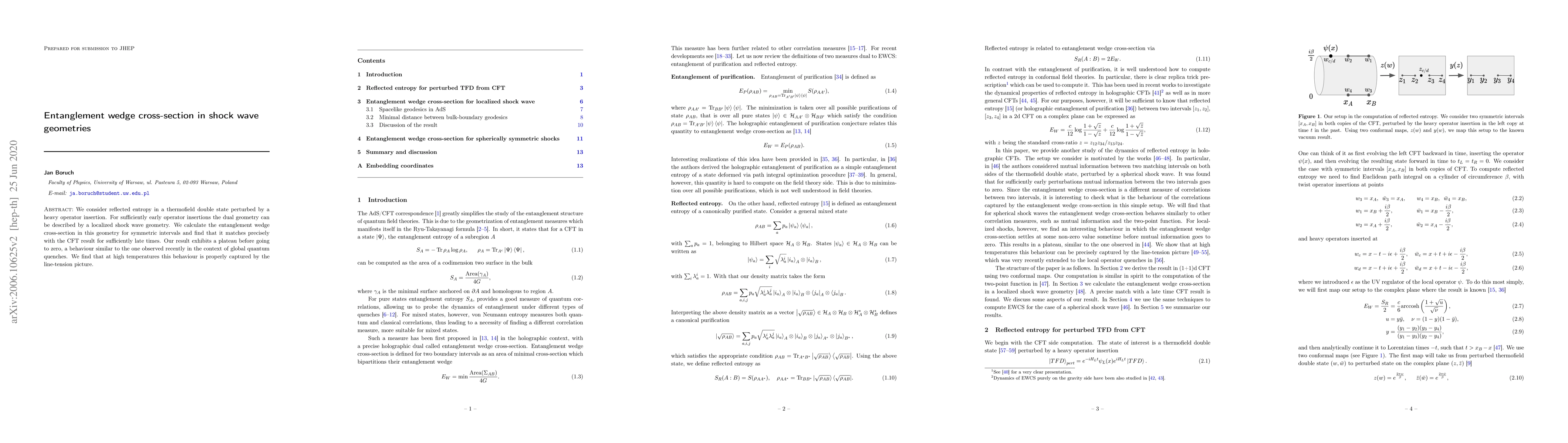 Researchers studied shock wave geometries in a thermofield double state and found that the entanglement wedge cross-section matches the CFT result for late times, exhibiting a plateau before going to zero.