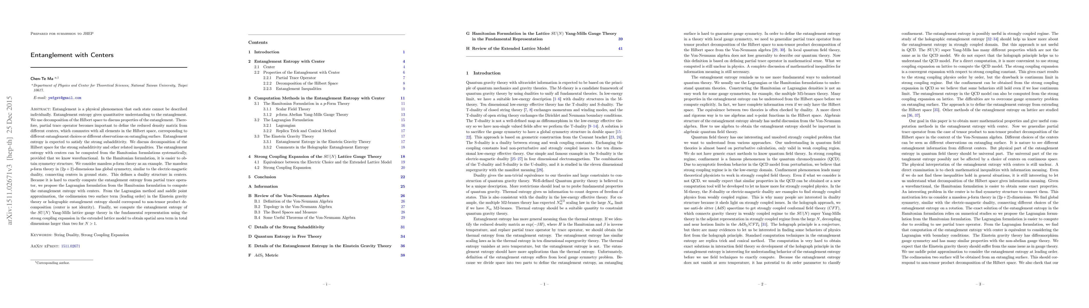 Entanglement is a physical phenomenon that each state cannot be described individually. Entanglement entropy gives quantitative understanding to the entanglement. We use decomposition of the Hilbert space to discuss properties of the entanglement. Therefore, partial trace operator becomes important to define the reduced density matrix from different centers, which commutes with all elements in the Hilbert space, corresponding to different entanglement choices or different observations on entangling surface. Entanglement entropy is expected to satisfy the strong subadditivity. We discuss decomposition of the Hilbert space for the strong subadditivity and other related inequalities. The entanglement entropy with centers can be computed from the Hamitonian formulations systematically, provided that we know wavefunctional. In the Hamitonian formulation, it is easier to obtain symmetry structure. We consider massless $p$-form theory as an example. The massless $p$-form theory in ($2p+2)$-dimensions has global symmetry, similar to the electric-magnetic duality, connecting centers in ground state. This defines a duality structure in centers. Because it is hard to exactly compute the entanglement entropy from partial trace operator, we propose the Lagrangian formulation from the Hamitonian formulation to compute the entanglement entropy with centers. From the Lagrangian method and saddle point approximation, the codimension two surface term (leading order) in the Einstein gravity theory or holographic entanglement entropy should correspond to non-tensor product decomposition (center is not identity). Finally, we compute the entanglement entropy of the $SU(N)$ Yang-Mills lattice gauge theory in the fundamental representation using the strong coupling expansion in the extended lattice model to obtain spatial area term in total dimensions larger than two for $N>1$.