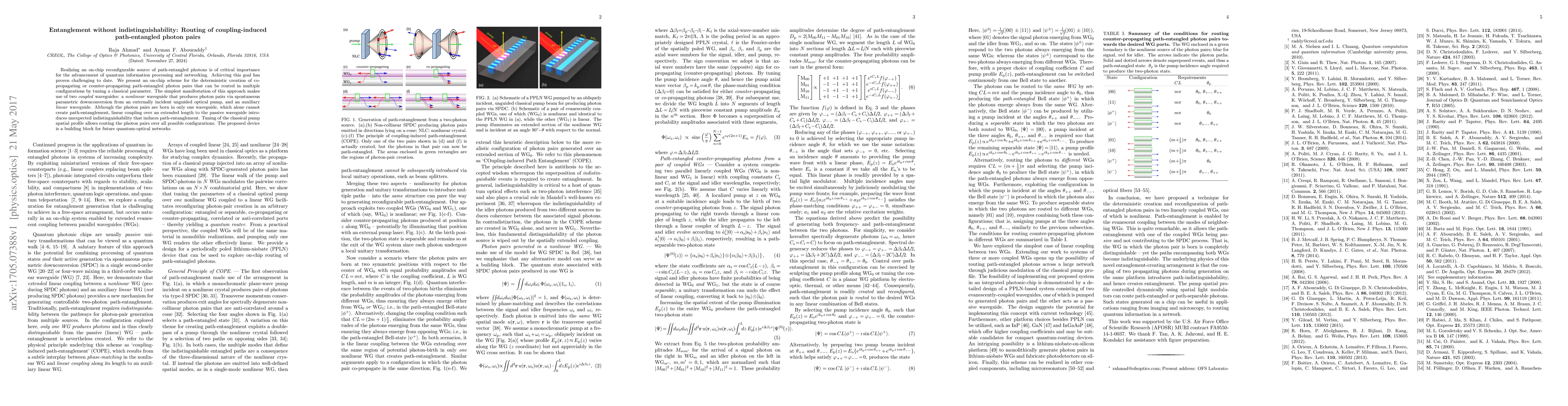 This paper presents an on-chip method for generating and routing path-entangled photon pairs via linear coupling between a nonlinear and a linear waveguide, without requiring indistinguishability of the initial states. The routing is controlled by tuning the classical pump spatial profile.