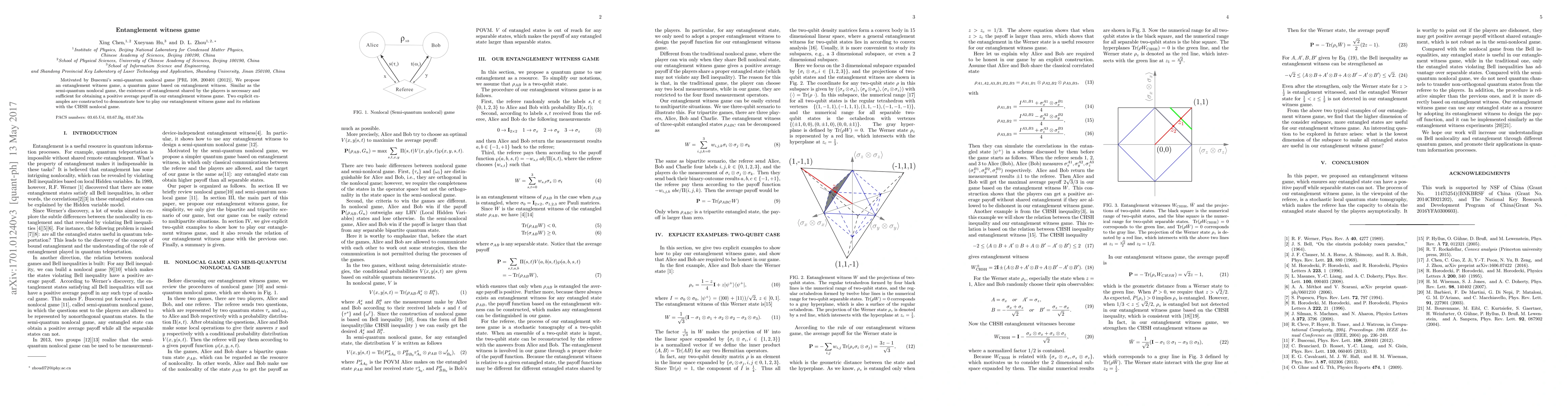 Motivated by Buscemi's semi-quantum nonlocal game [PRL 108, 200401(2012)], We propose an entanglement witness game, a quantum game based on entanglement witness. Similar as the semi-quantum nonlocal game, the existence of entanglement shared by the players is necessary and sufficient for obtaining a positive average payoff in our entanglement witness game. Two explicit examples are constructed to demonstrate how to play our entanglement witness game and its relations with the CHSH nonlocal game.