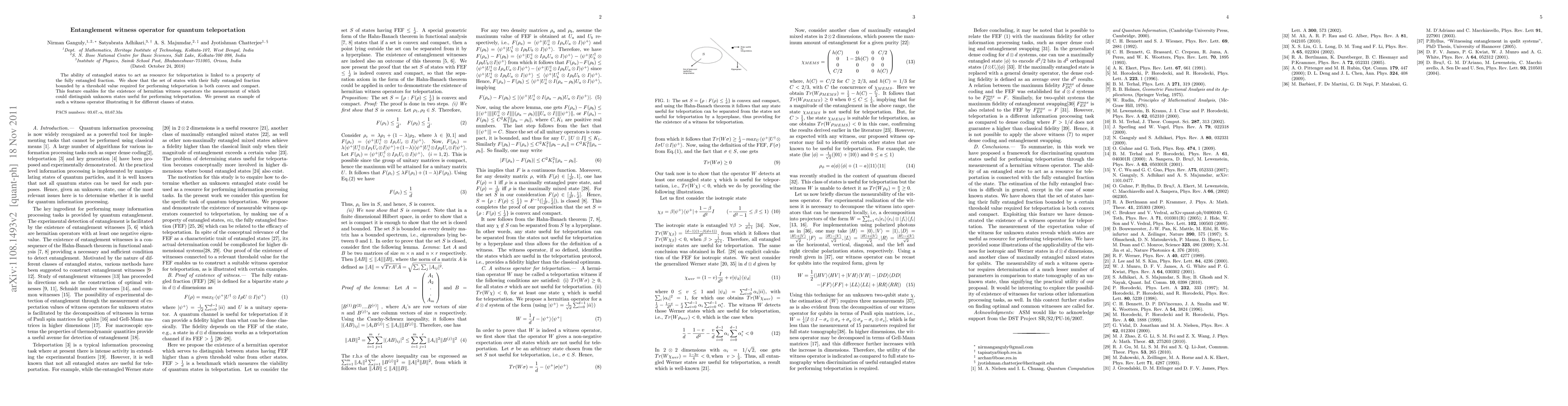 The paper introduces a hermitian entanglement witness operator that can identify states suitable for quantum teleportation based on their fully entangled fraction. This operator's existence confirms the convex and compact nature of states necessary for teleportation.