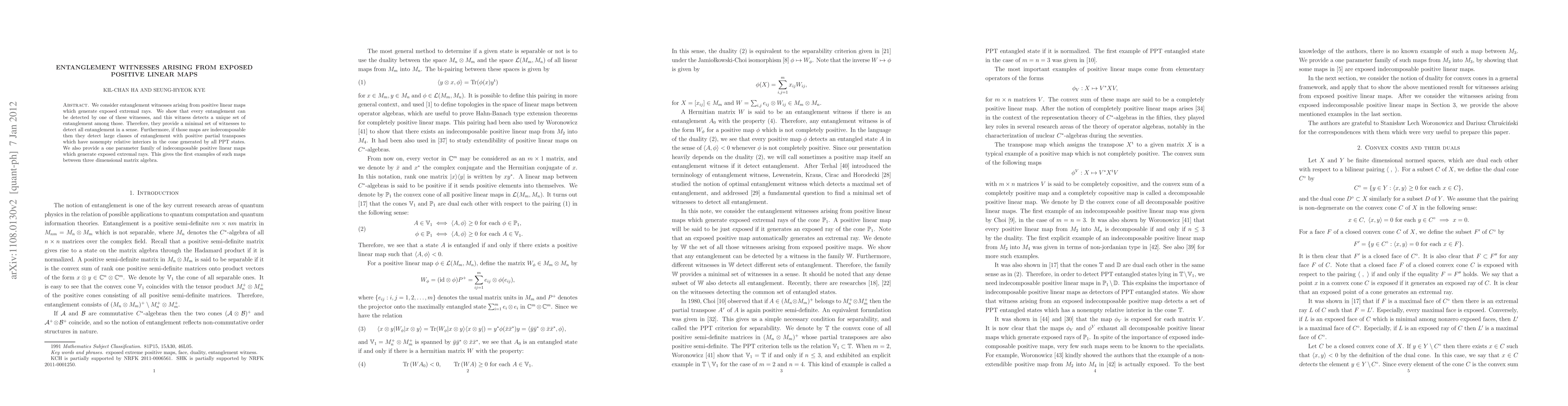 We consider entanglement witnesses arising from positive linear maps which generate exposed extremal rays. We show that every entanglement can be detected by one of these witnesses, and this witness detects a unique set of entanglement among those. Therefore, they provide a minimal set of witnesses to detect all entanglement in a sense. Furthermore, if those maps are indecomposable then they detect large classes of entanglement with positive partial transposes which have nonempty relative interiors in the cone generated by all PPT states. We also provide a one parameter family of indecomposable positive linear maps which generate exposed extremal rays. This gives the first examples of such maps between three dimensional matrix algebra.