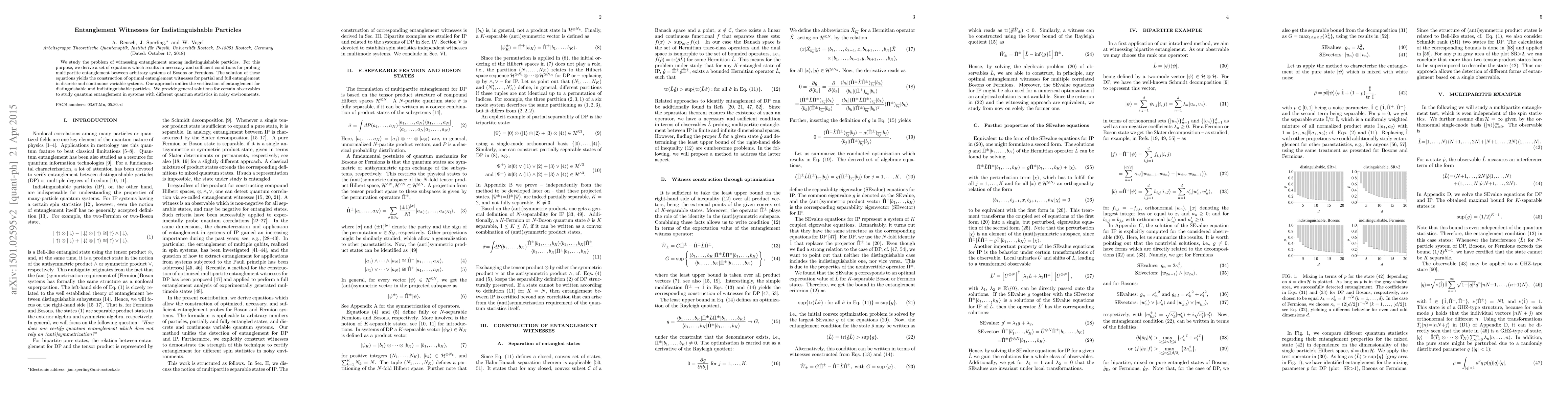 This paper develops necessary and sufficient conditions for identifying entanglement in systems of indistinguishable particles, deriving equations to construct optimal entanglement witnesses for both partial and full entanglement in both discrete and continuous variable systems. The approach unifies entanglement verification for both distinguishable and indistinguishable particles, with applications in noisy environments.