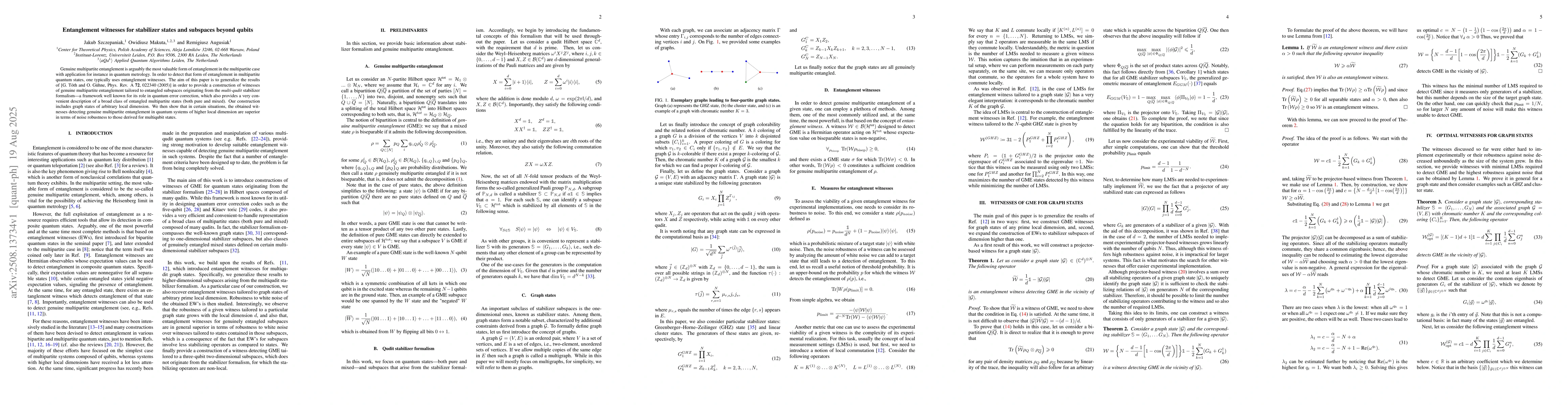 Genuine multipartite entanglement is arguably the most valuable form of entanglement in the multipartite case, with applications, for instance, in quantum metrology. In order to detect that form of entanglement in multipartite quantum states, one typically uses entanglement witnesses. The aim of this paper is to generalize the results of [G. T\'oth and O. G\"uhne, Phys. Rev. A \textbf{72}, 022340 (2005)] in order to provide a construction of witnesses of genuine multipartite entanglement tailored to entangled subspaces originating from the \textit{multi-qudit} stabilizer formalism -- a framework well known for its role in quantum error correction, which also provides a very convenient description of a broad class of entangled multipartite states (both pure and mixed). Our construction includes graph states of arbitrary local dimension. We then show that in certain situations, the obtained witnesses detecting genuine multipartite entanglement in quantum systems of higher local dimension are superior in terms of noise robustness to those derived for multiqubit states.