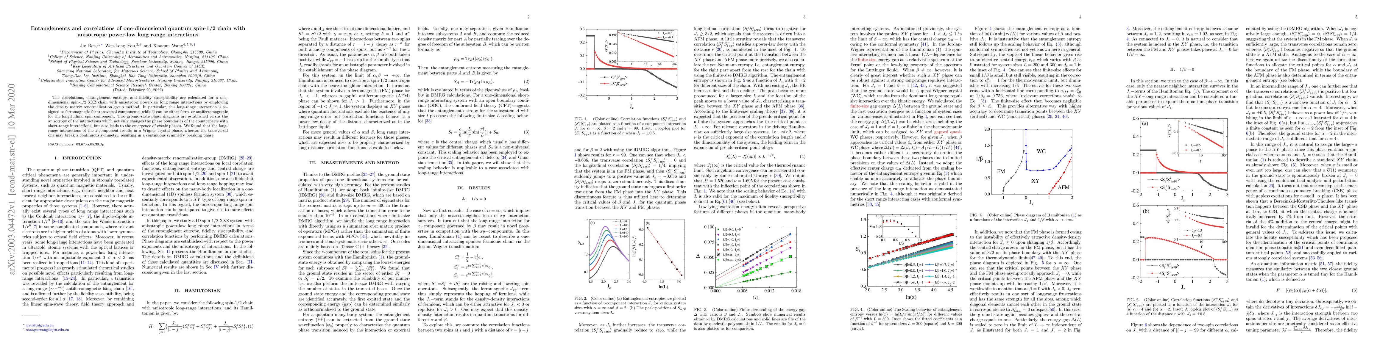 This paper investigates the entanglement and correlations in a one-dimensional spin-1/2 XXZ chain with anisotropic power-law long-range interactions using the density matrix renormalization group method. It reveals exotic ground-state phases, including a Wigner crystal phase due to longitudinal interactions and a continuous symmetry breaking phase from transversal interactions.