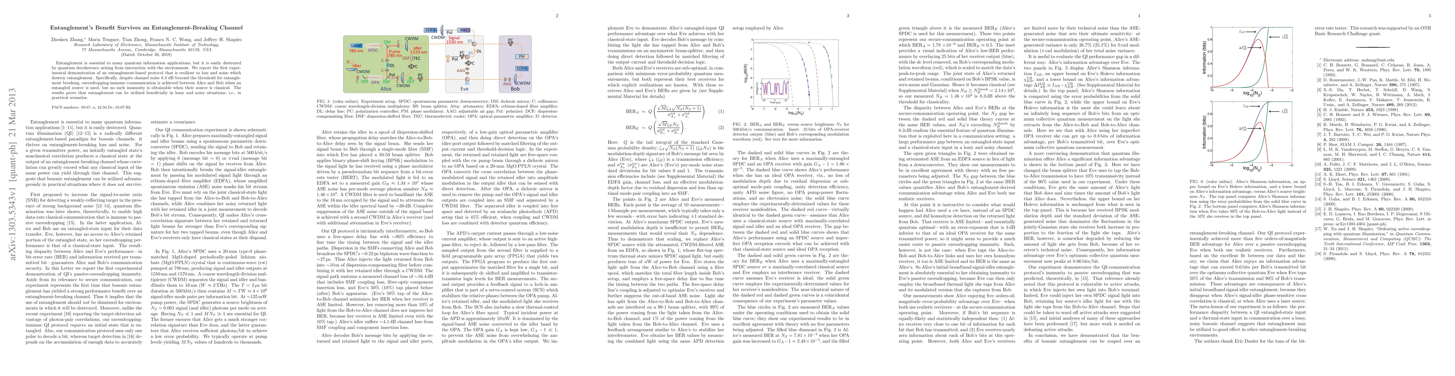 Entanglement is essential to many quantum information applications, but it is easily destroyed by quantum decoherence arising from interaction with the environment. We report the first experimental demonstration of an entanglement-based protocol that is resilient to loss and noise which destroy entanglement. Specifically, despite channel noise 8.3 dB beyond the threshold for entanglement breaking, eavesdropping-immune communication is achieved between Alice and Bob when an entangled source is used, but no such immunity is obtainable when their source is classical. The results prove that entanglement can be utilized beneficially in lossy and noisy situations, i.e., in practical scenarios.