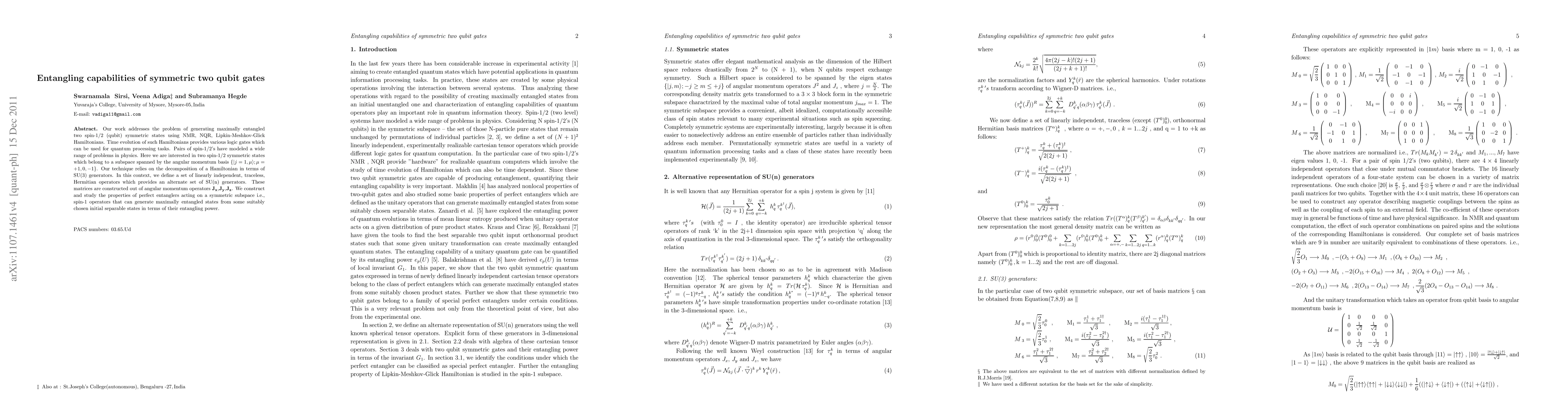 This paper explores generating maximally entangled symmetric two-qubit states using NMR, NQR, and Lipkin-Meshkov-Glick Hamiltonians, focusing on time evolution for quantum processing. It introduces a new set of SU(3) generators based on angular momentum operators to construct perfect entanglers for creating maximally entangled states.