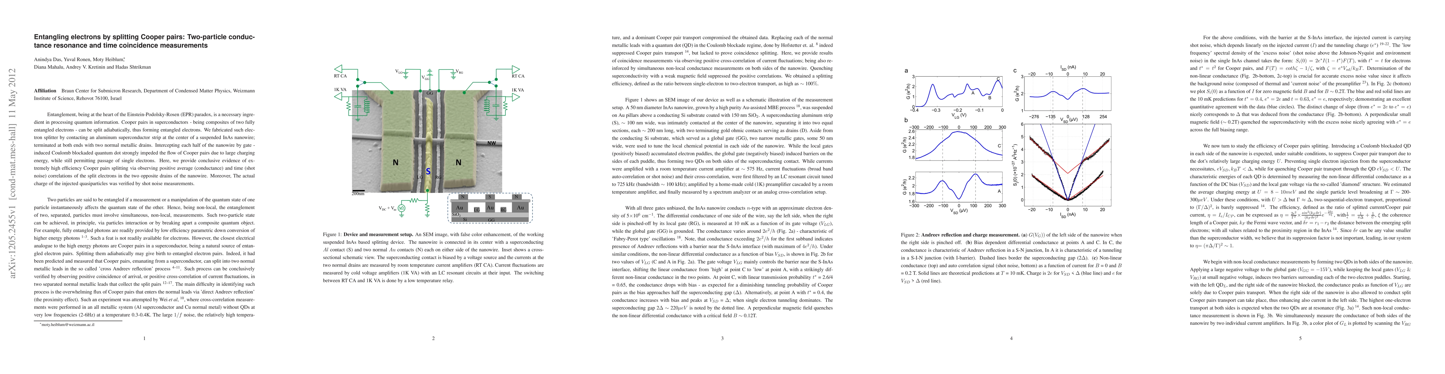 This paper demonstrates the high-efficiency splitting of Cooper pairs into entangled electrons using a suspended InAs nanowire contacted by a superconducting aluminum strip. The study shows strong positive correlations in conductance and shot noise, confirming the successful entanglement of split electrons.