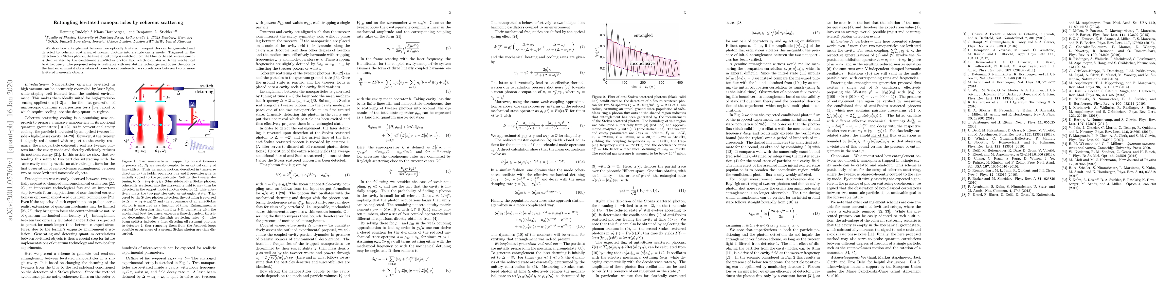 This paper demonstrates the generation and detection of entanglement between two levitated nanoparticles via coherent scattering of tweezer photons into a single cavity mode, verified by conditioned anti-Stokes photon oscillations. The proposed method is feasible with upcoming technology and could enable the first experimental observation of non-classical correlations in nanoscale objects.