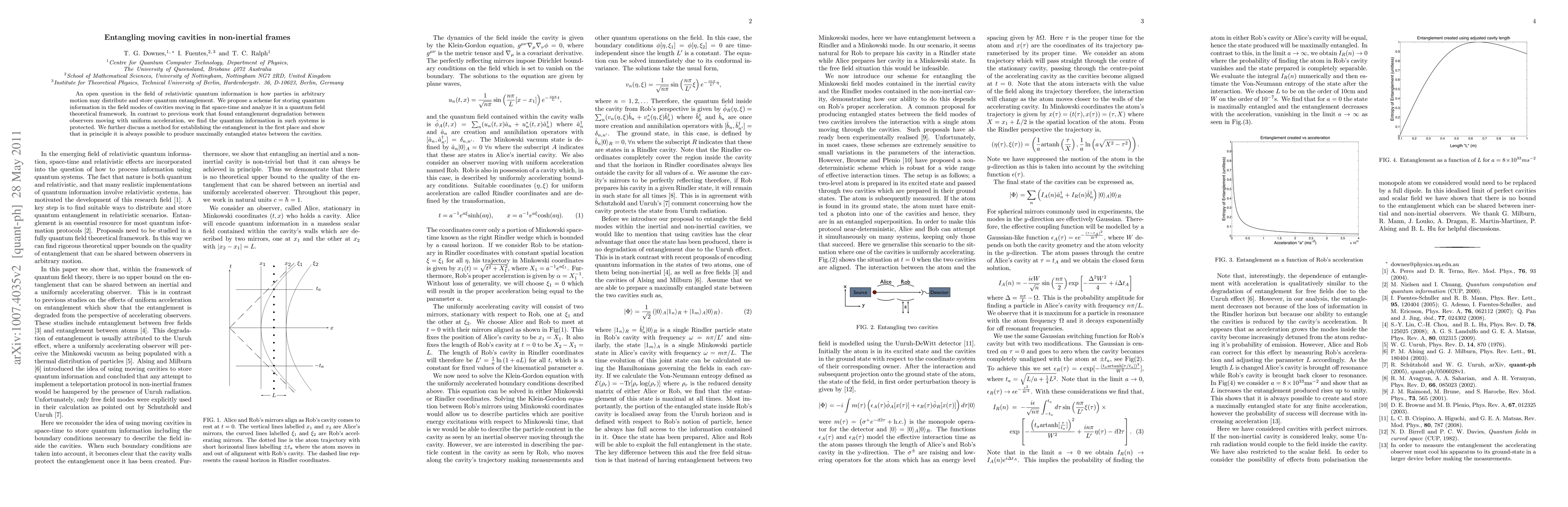 An open question in the field of relativistic quantum information is how parties in arbitrary motion may distribute and store quantum entanglement. We propose a scheme for storing quantum information in the field modes of cavities moving in flat space-time and analyze it in a quantum field theoretical framework. In contrast to previous work that found entanglement degradation between observers moving with uniform acceleration, we find the quantum information in such systems is protected. We further discuss a method for establishing the entanglement in the first place and show that in principle it is always possible to produce maximally entangled states between the cavities.