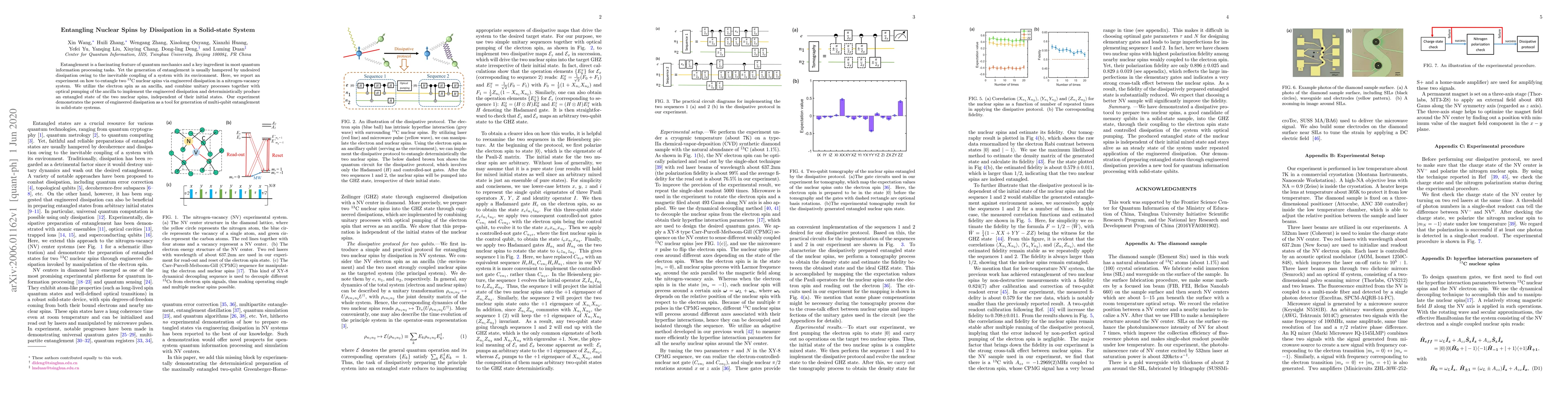 This paper demonstrates an innovative method to entangle two $^{13}$C nuclear spins using engineered dissipation in a nitrogen-vacancy system, utilizing the electron spin as an ancilla. The approach combines unitary processes and optical pumping to create multi-qubit entanglement, showcasing a novel technique for quantum information processing in solid-state systems.