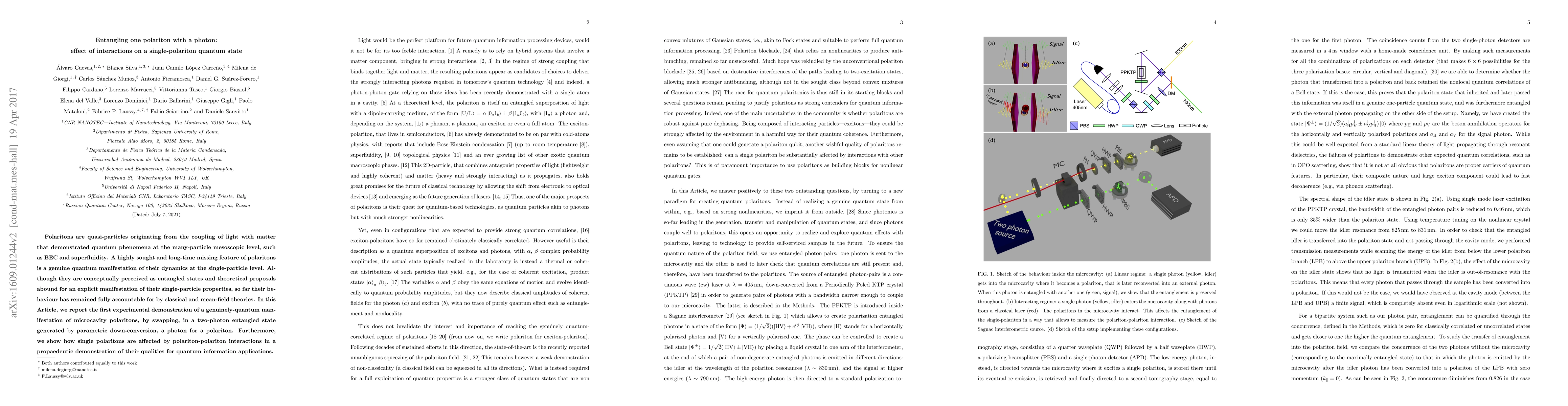 Polaritons are quasi-particles originating from the coupling of light with matter that demonstrated quantum phenomena at the many-particle mesoscopic level, such as BEC and superfluidity. A highly sought and long-time missing feature of polaritons is a genuine quantum manifestation of their dynamics at the single-particle level. Although they are conceptually perceived as entangled states and theoretical proposals abound for an explicit manifestation of their single-particle properties, so far their behaviour has remained fully accountable for by classical and mean-field theories. In this Article, we report the first experimental demonstration of a genuinely-quantum manifestation of microcavity polaritons, by swapping, in a two-photon entangled state generated by parametric down-conversion, a photon for a polariton. Furthermore, we show how single polaritons are affected by polariton-polariton interactions in a propaedeutic demonstration of their qualities for quantum information applications.