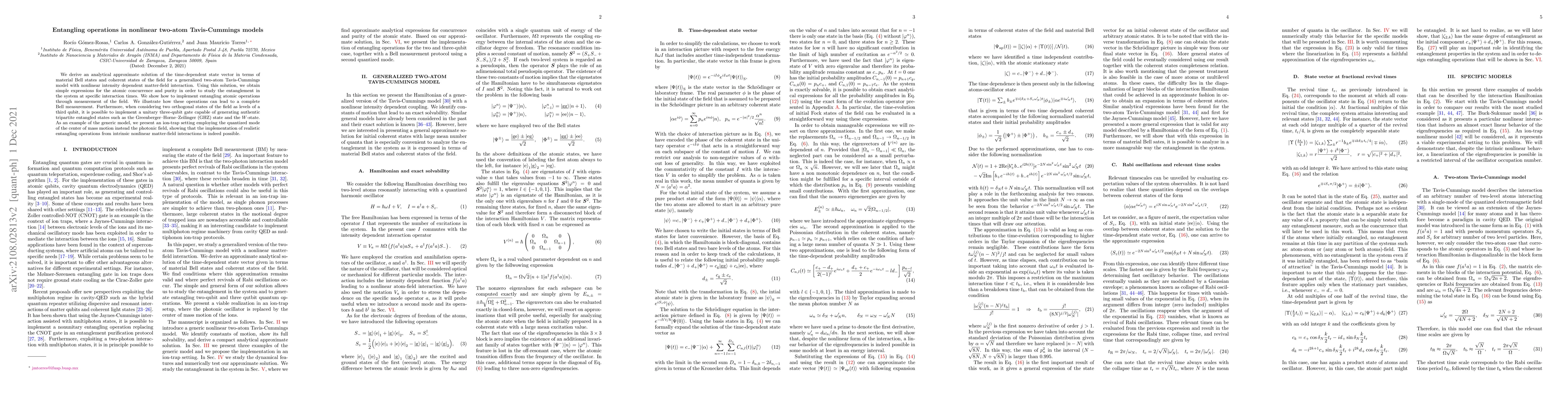 This paper presents an analytical solution for the time-dependent state of a nonlinear two-atom Tavis-Cummings model, enabling the study of entanglement through atomic concurrence and purity. It demonstrates the implementation of entangling operations via field measurements, leading to complete Bell measurements and the generation of tripartite entangled states like GHZ and W-states.