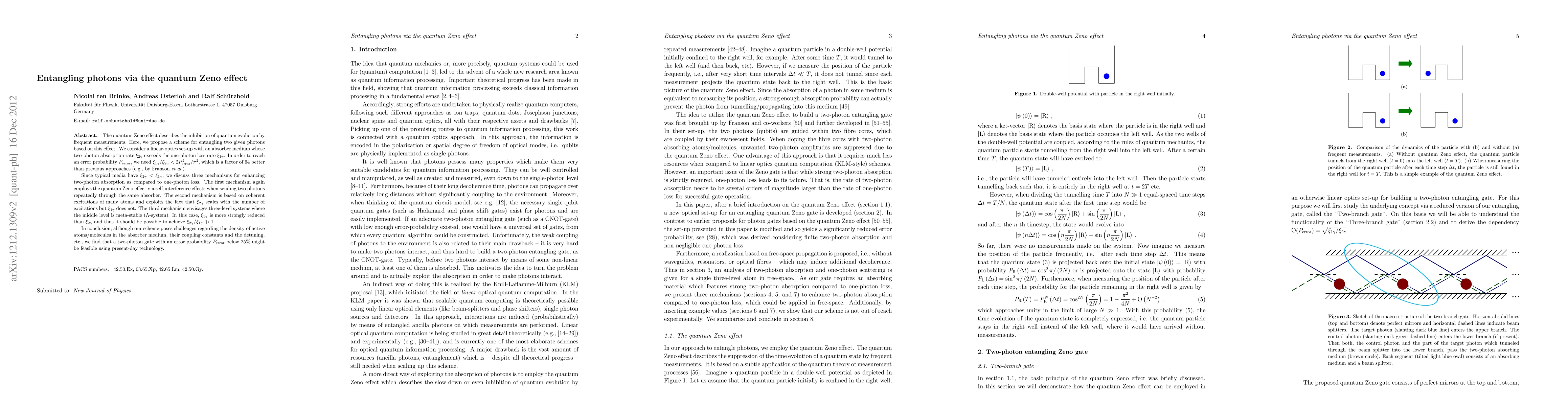 This paper proposes a novel scheme for entangling photons using the quantum Zeno effect, achieving significantly lower error rates compared to previous methods. It explores three mechanisms to enhance two-photon absorption over one-photon loss, suggesting potential feasibility for a two-photon gate with error probabilities below 25% using current technology.