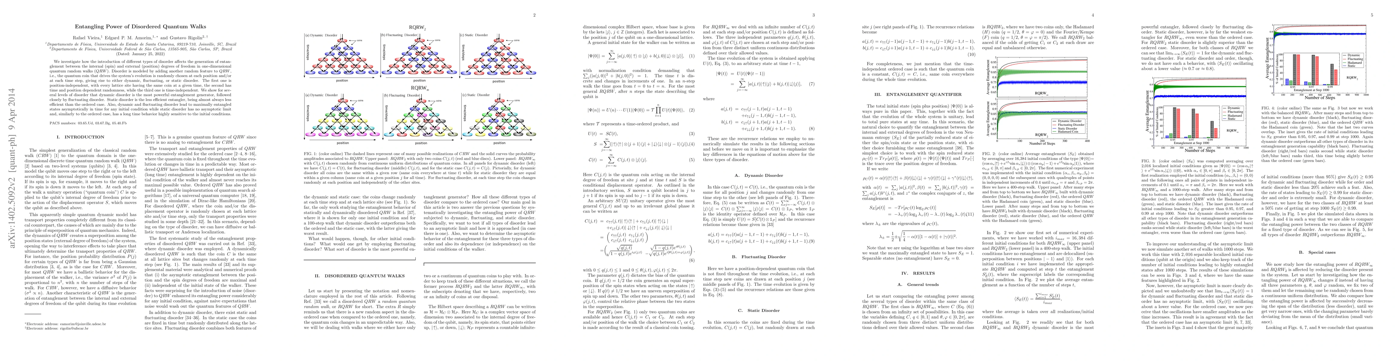 We investigate how the introduction of different types of disorder affects the generation of entanglement between the internal (spin) and external (position) degrees of freedom in one-dimensional quantum random walks (QRW). Disorder is modeled by adding another random feature to QRW, i.e., the quantum coin that drives the system's evolution is randomly chosen at each position and/or at each time step, giving rise to either dynamic, fluctuating, or static disorder. The first one is position-independent, with every lattice site having the same coin at a given time, the second has time and position dependent randomness, while the third one is time-independent. We show for several levels of disorder that dynamic disorder is the most powerful entanglement generator, followed closely by fluctuating disorder. Static disorder is the less efficient entangler, being almost always less efficient than the ordered case. Also, dynamic and fluctuating disorder lead to maximally entangled states asymptotically in time for any initial condition while static disorder has no asymptotic limit and, similarly to the ordered case, has a long time behavior highly sensitive to the initial conditions.
