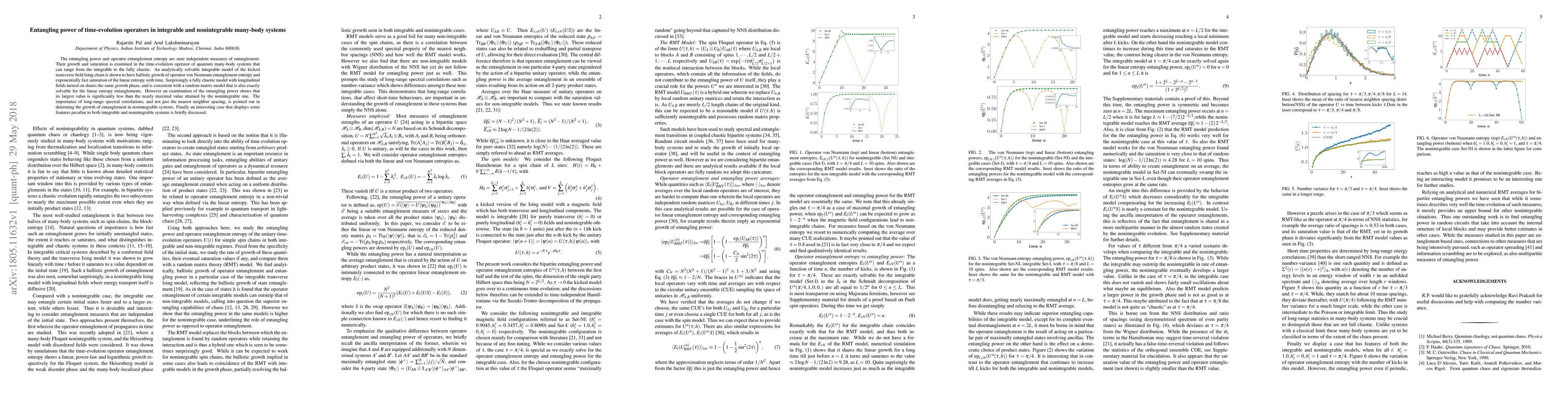 This paper investigates the entangling power and operator entanglement entropy in both integrable and nonintegrable quantum many-body systems, finding ballistic growth in integrable systems and shared growth phases in chaotic systems, though the entangling power is significantly lower in chaotic systems. The study highlights the role of long-range spectral correlations in determining entanglement growth in nonintegrable systems.