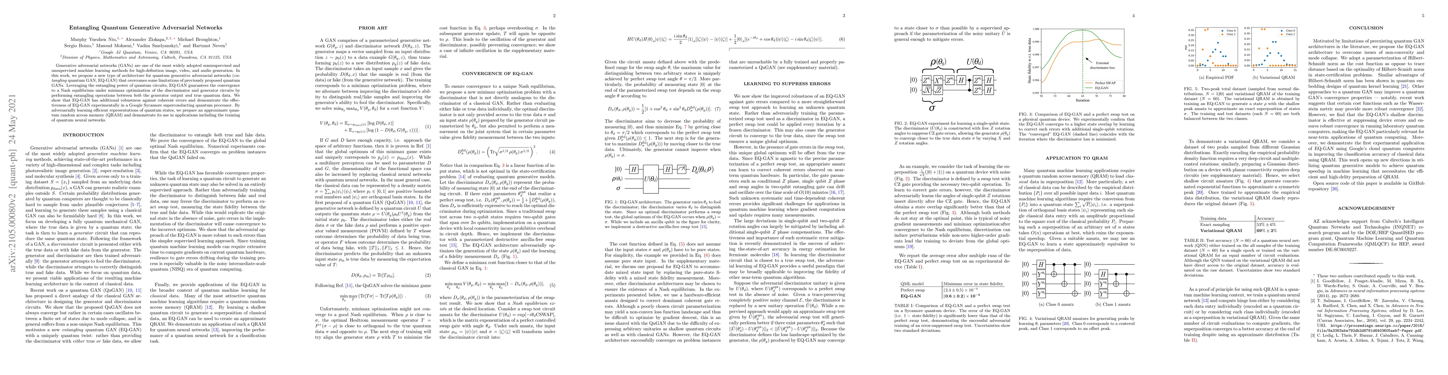 Generative adversarial networks (GANs) are one of the most widely adopted semisupervised and unsupervised machine learning methods for high-definition image, video, and audio generation. In this work, we propose a new type of architecture for quantum generative adversarial networks (entangling quantum GAN, EQ-GAN) that overcomes some limitations of previously proposed quantum GANs. Leveraging the entangling power of quantum circuits, EQ-GAN guarantees the convergence to a Nash equilibrium under minimax optimization of the discriminator and generator circuits by performing entangling operations between both the generator output and true quantum data. We show that EQ-GAN has additional robustness against coherent errors and demonstrate the effectiveness of EQ-GAN experimentally in a Google Sycamore superconducting quantum processor. By adversarially learning efficient representations of quantum states, we prepare an approximate quantum random access memory (QRAM) and demonstrate its use in applications including the training of quantum neural networks.
