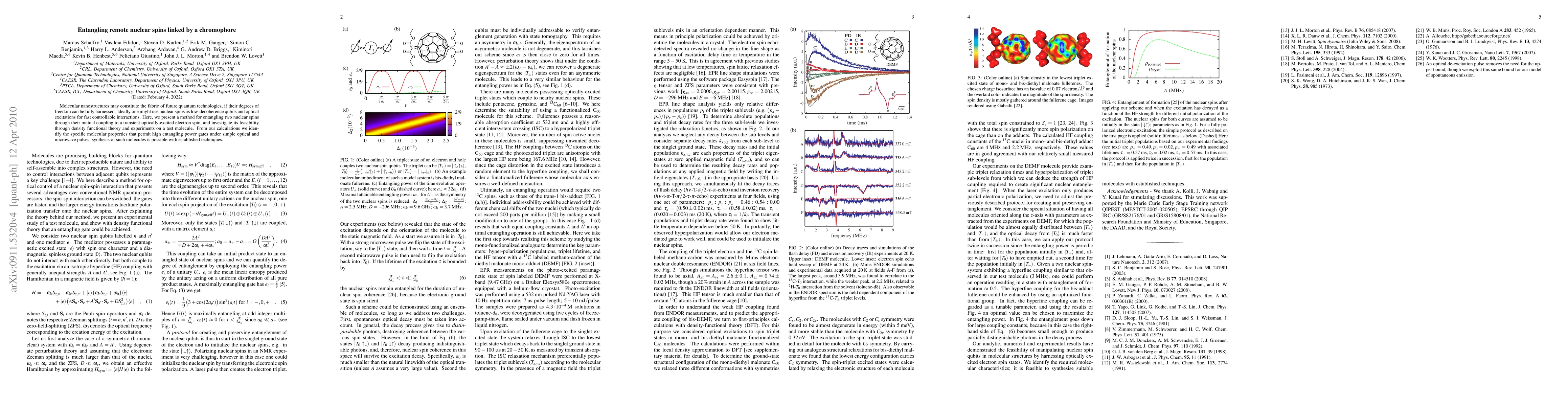 The research presents a method for entangling two nuclear spins through their mutual coupling to a transient optically-excited electron spin, supported by density functional theory and experiments on a test molecule.