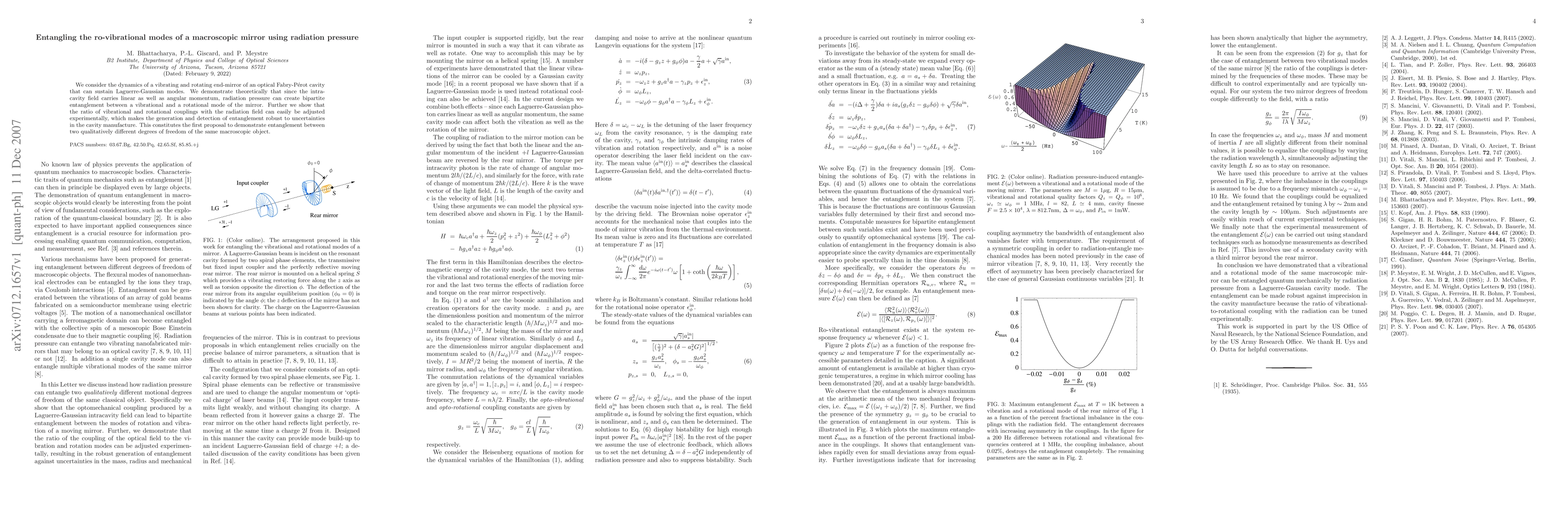 This paper proposes a method to entangle the ro-vibrational modes of a macroscopic mirror using radiation pressure within an optical cavity. It demonstrates theoretically that the intra-cavity field's angular and linear momentum can create bipartite entanglement between the mirror's vibrational and rotational modes, with adjustable coupling ratios to enhance robustness against experimental uncertainties.