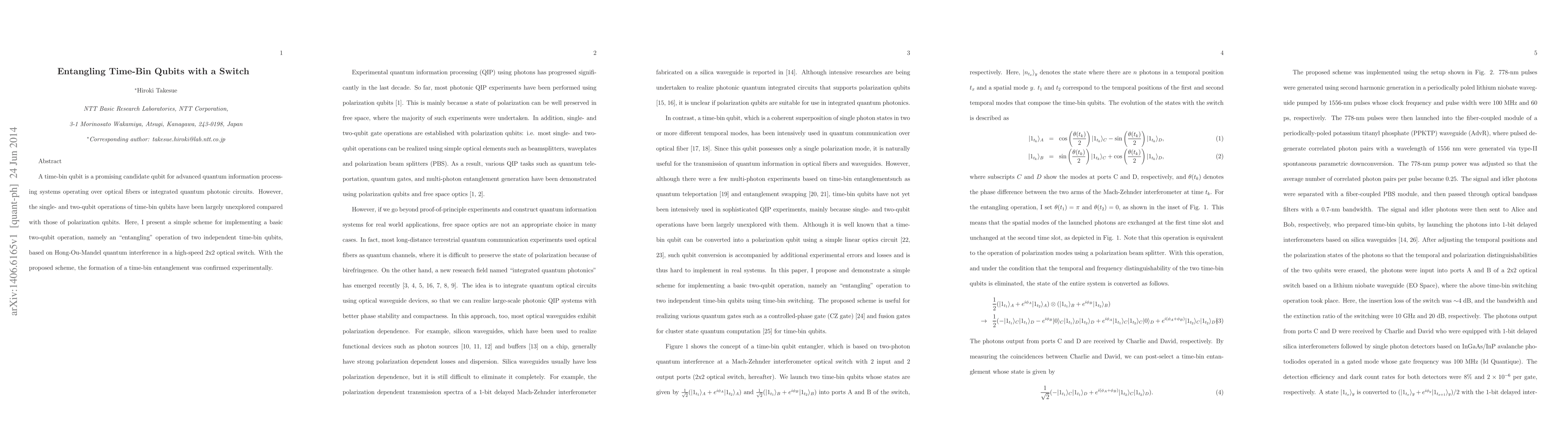 This paper proposes a method for entangling time-bin qubits using a high-speed 2x2 optical switch based on Hong-Ou-Mandel interference, demonstrating experimentally the feasibility of basic two-qubit operations for time-bin qubits.