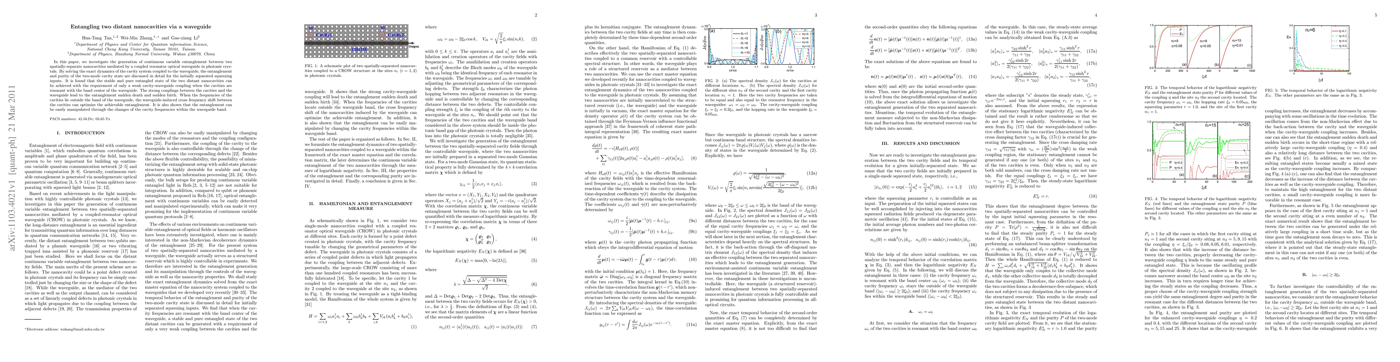This research demonstrates the creation of stable entanglement between two distant nanocavities via a waveguide in photonic crystals, requiring only weak cavity-waveguide coupling and resonance with waveguide's band center. Manipulation of entanglement is possible through altering cavity frequencies within the waveguide band.