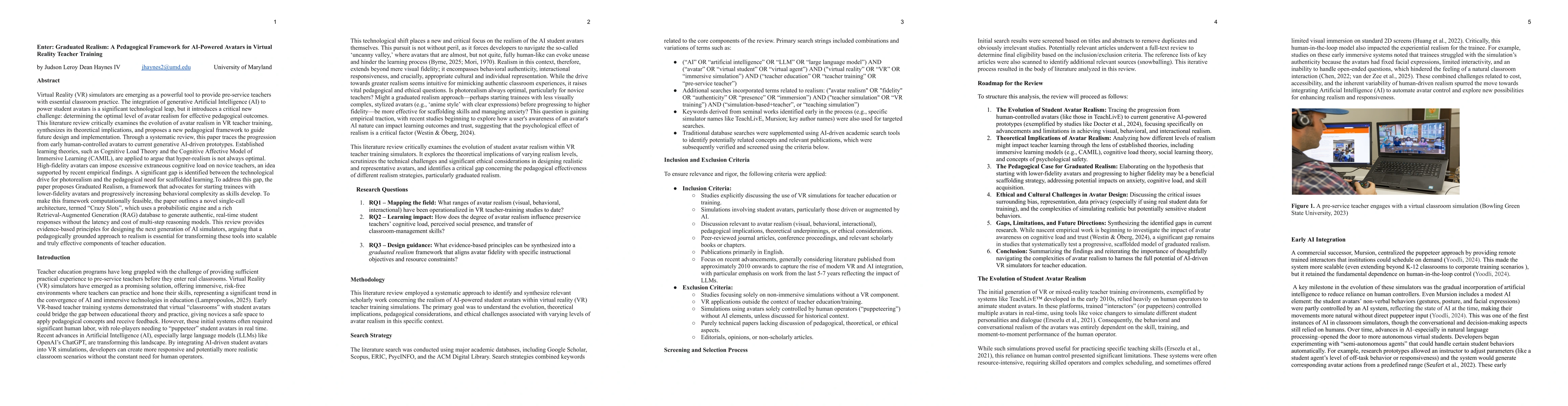 Virtual Reality simulators offer a powerful tool for teacher training, yet the integration of AI-powered student avatars presents a critical challenge: determining the optimal level of avatar realism for effective pedagogy. This literature review examines the evolution of avatar realism in VR teacher training, synthesizes its theoretical implications, and proposes a new pedagogical framework to guide future design. Through a systematic review, this paper traces the progression from human-controlled avatars to generative AI prototypes. Applying learning theories like Cognitive Load Theory, we argue that hyper-realism is not always optimal, as high-fidelity avatars can impose excessive extraneous cognitive load on novices, a stance supported by recent empirical findings. A significant gap exists between the technological drive for photorealism and the pedagogical need for scaffolded learning. To address this gap, we propose Graduated Realism, a framework advocating for starting trainees with lower-fidelity avatars and progressively increasing behavioral complexity as skills develop. To make this computationally feasible, we outline a novel single-call architecture, Crazy Slots, which uses a probabilistic engine and a Retrieval-Augmented Generation database to generate authentic, real-time responses without the latency and cost of multi-step reasoning models. This review provides evidence-based principles for designing the next generation of AI simulators, arguing that a pedagogically grounded approach to realism is essential for creating scalable and effective teacher education tools.