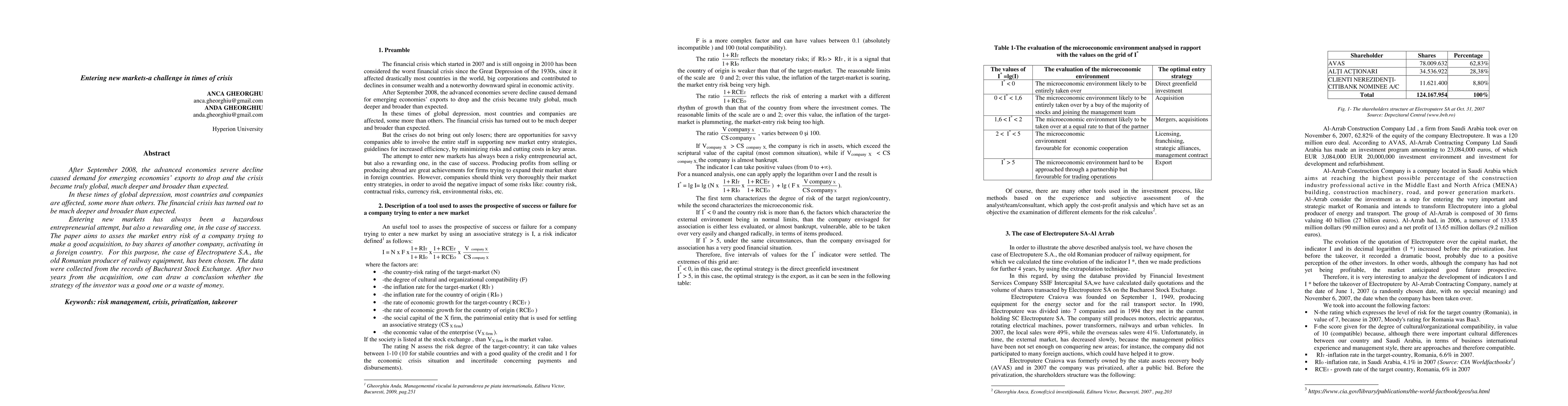 This paper examines the risks associated with entering new markets during a global financial crisis, using the case of Electroputere S.A.'s acquisition of shares in a foreign company. It analyzes the market entry strategy's success two years post-acquisition, assessing whether the investment was profitable or a financial loss.