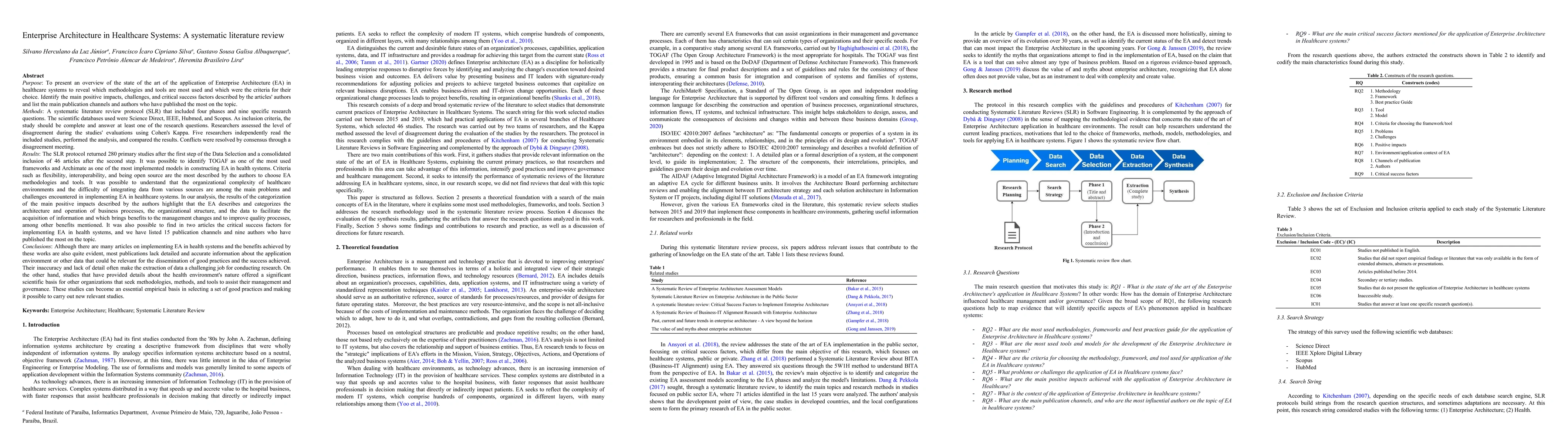 This paper systematically reviews literature on enterprise architecture (EA) applications in healthcare systems, identifying key methodologies, tools, best practices, and challenges. The review consolidates 46 studies, highlighting EA's positive impacts, critical success factors, and the most influential authors and publication channels in this field.