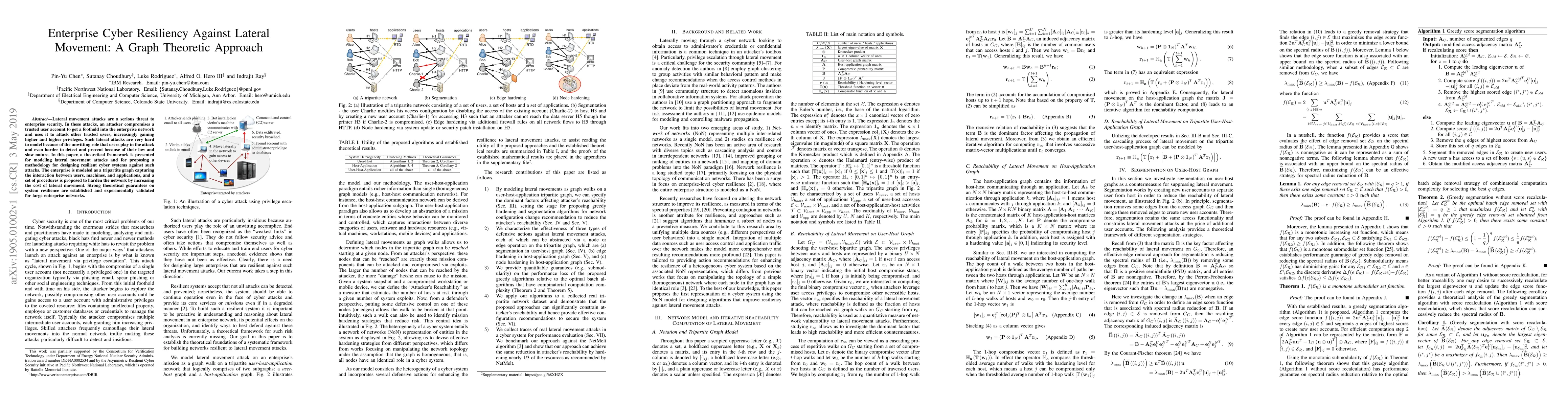 This paper proposes a graph theoretic framework to model and mitigate lateral movement attacks in enterprise networks, using a tripartite graph to represent user, machine, and application interactions. It introduces procedures to enhance network resilience by increasing the cost of lateral movement, with strong theoretical guarantees and experimental validation on large networks.