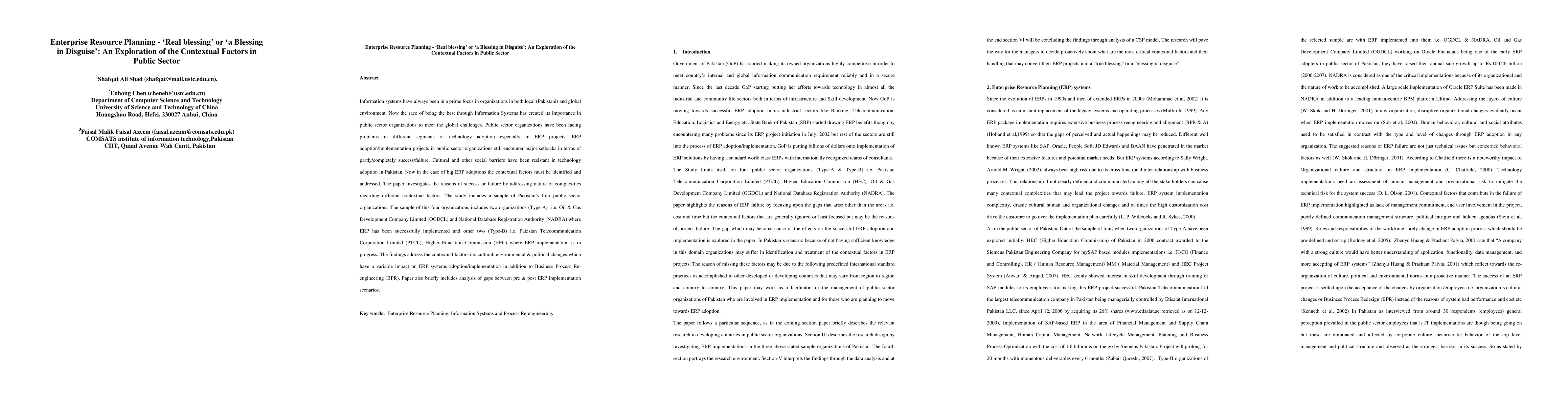 This paper explores the contextual factors influencing ERP adoption in Pakistan's public sector, comparing successful implementations in organizations like OGDCL and NADRA to ongoing projects in PTCL and HEC. It identifies cultural, environmental, and political factors affecting ERP success or failure, alongside Business Process Re-engineering, and analyzes gaps between pre- and post-implementation scenarios.