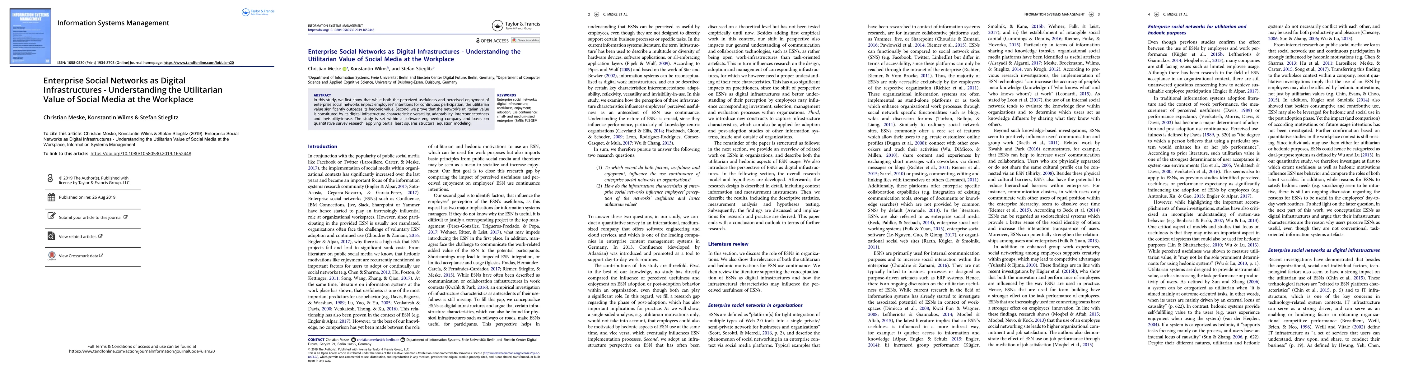 This study reveals that enterprise social networks' utilitarian value, driven by their digital infrastructure characteristics like versatility and adaptability, significantly influences employees' continuous participation intentions more than hedonic value. The research, conducted in a software engineering company, uses quantitative surveys and structural equation modeling.