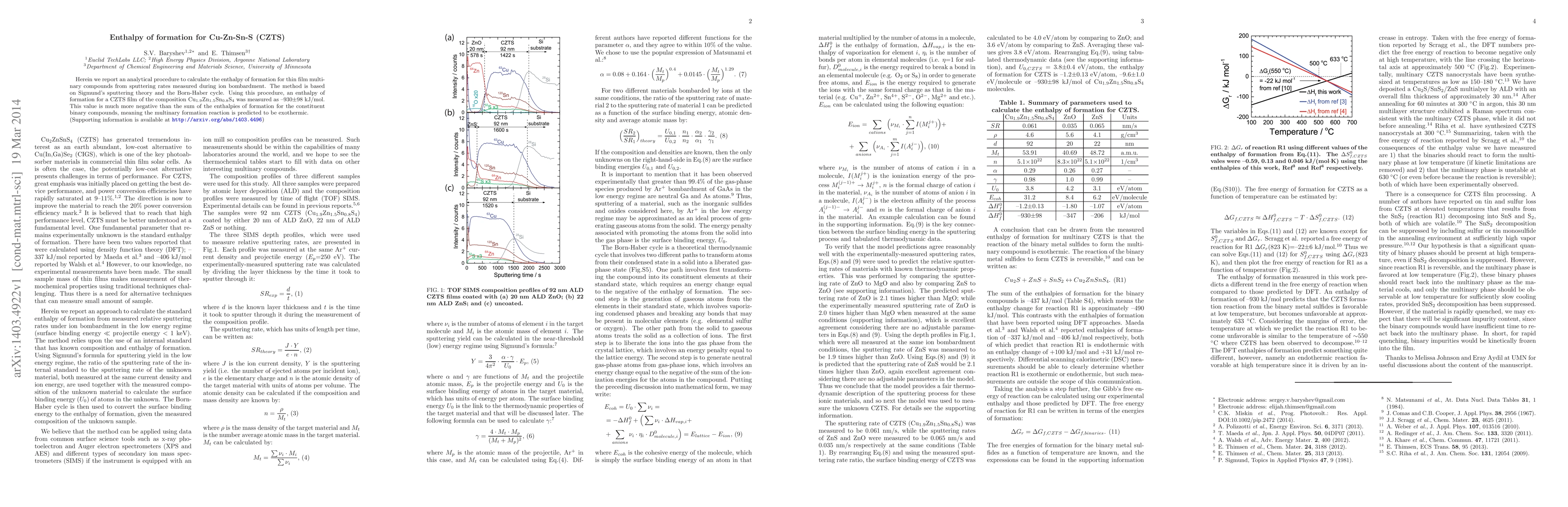 Herein we report an analytical procedure to calculate the enthalpy of formation for thin film multinary compounds from sputtering rates measured during ion bombardment. The method is based on Sigmund's sputtering theory and the Born-Haber cycle. Using this procedure, an enthalpy of formation for a CZTS film of the composition Cu$_{1.9}$Zn$_{1.5}$Sn$_{0.8}$S$_4$ was measured as -930$\pm$98 kJ/mol. This value is much more negative than the sum of the enthalpies of formation for the constituent binary compounds, meaning the multinary formation reaction is predicted to be exothermic.