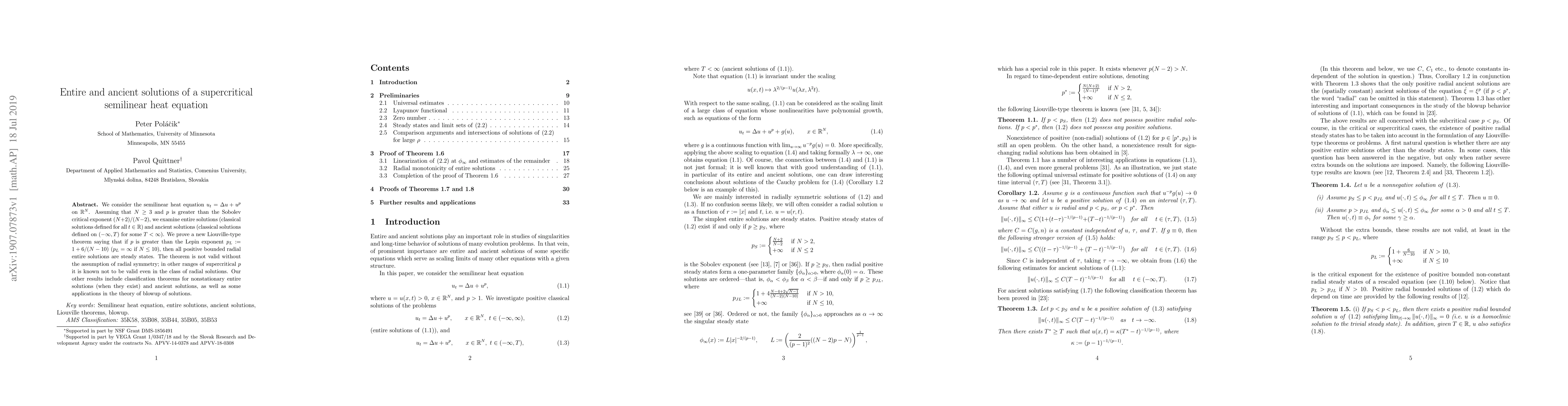 This paper explores entire and ancient solutions to a supercritical semilinear heat equation, proving a Liouville-type theorem that positive bounded radial entire solutions are steady states if the exponent exceeds a certain critical value. It also classifies nonstationary entire and ancient solutions and discusses implications for blowup theory.