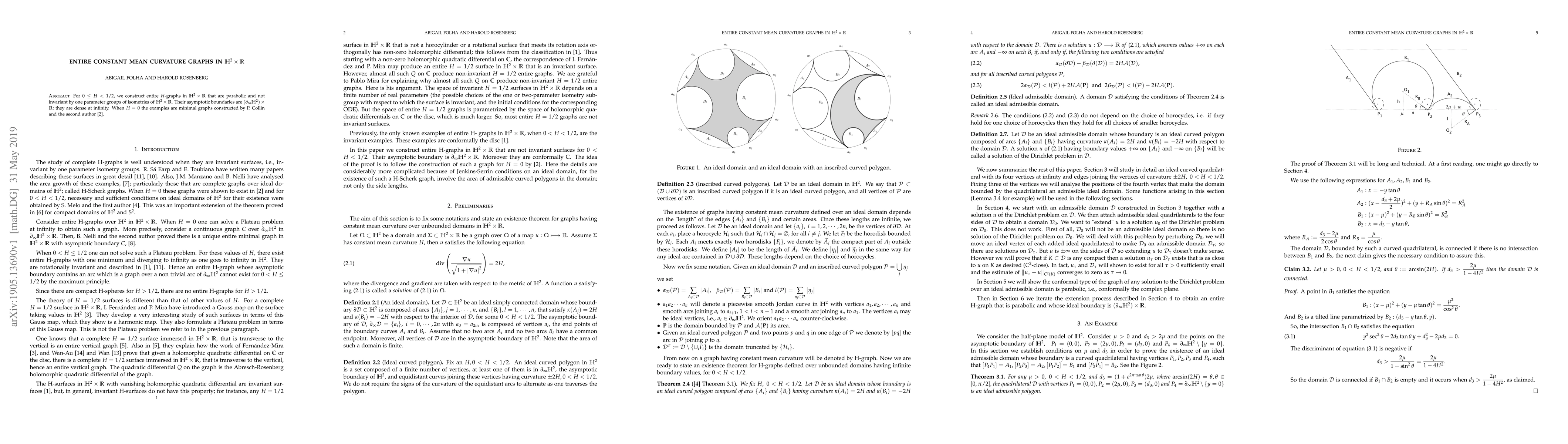 Researchers construct entire constant mean curvature graphs in $ ext{H}^2 imes ext{R}$ with specific values of H, creating parabolic examples that are not invariant to certain isometry groups.