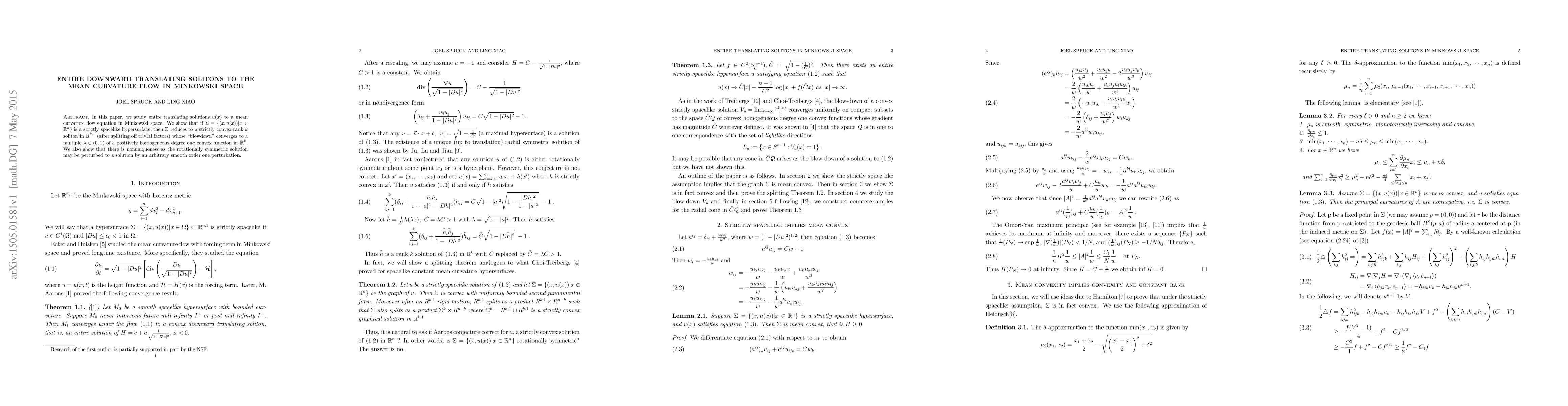 In this paper, we study entire translating solutions $u(x)$ to a mean curvature flow equation in Minkowski space. We show that if $\Sigma=\{(x, u(x))| x\in\mathbb{R}^n\}$ is a strictly spacelike hypersurface, then $\Sigma$ reduces to a strictly convex rank k soliton in $\mathbb{R}^{k, 1}$ (after splitting off trivial factors) whose "blowdown" converges to a multiple $\lambda\in(0, 1)$ of a positively homogeneous degree one convex function in $\mathbb{R}^k$. We also show that there is nonuniqueness as the rotationally symmetric solution may be perturbed to a solution by an arbitrary smooth order one perturbation.