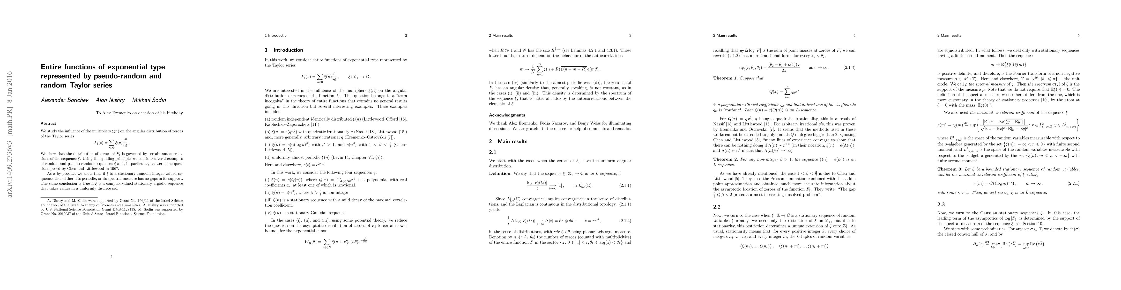 We study the influence of the multipliers $\xi (n)$ on the angular distribution of zeroes of the Taylor series \[ F_\xi (z) = \sum_{n\ge 0} \xi (n) \frac{z^n}{n!}\,. \] We show that the distribution of zeroes of $ F_\xi $ is governed by certain autocorrelations of the sequence $ \xi $. Using this guiding principle, we consider several examples of random and pseudo-random sequences $\xi$ and, in particular, answer some questions posed by Chen and Littlewood in 1967. As a by-product we show that if $\xi$ is a stationary random integer-valued sequence, then either it is periodic, or its spectral measure has no gaps in its support. The same conclusion is true if $\xi$ is a complex-valued stationary ergodic sequence that takes values from a uniformly discrete set.