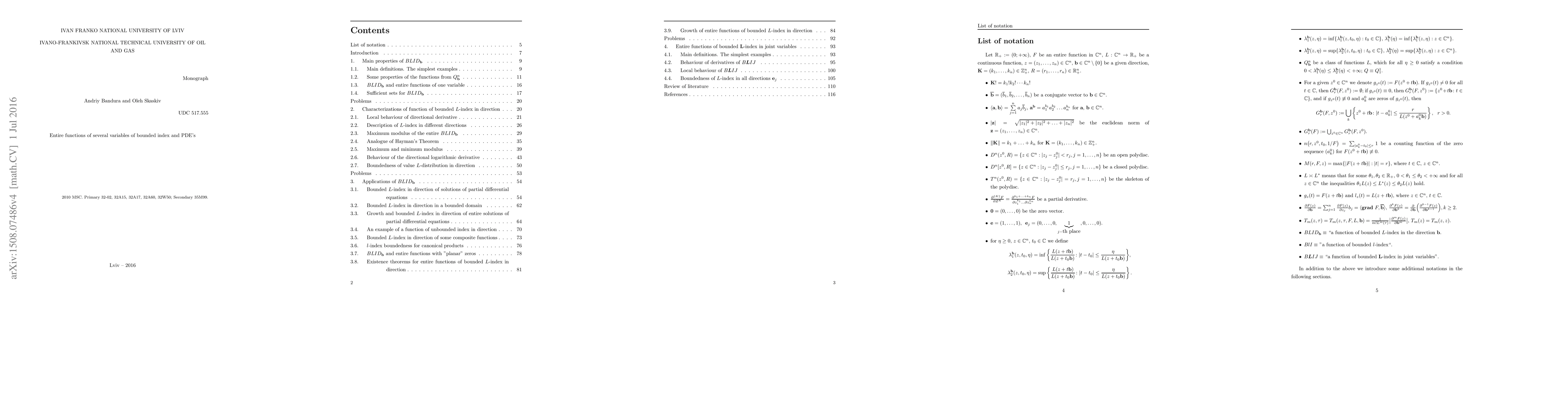 This monograph explores entire functions of several variables with bounded index, generalizing B. Lepson's definition for multiple dimensions. It provides criteria for L-index boundedness, including conditions for entire functions with planar zeros and solutions to certain partial differential equations, and discusses applications in value distribution theory.