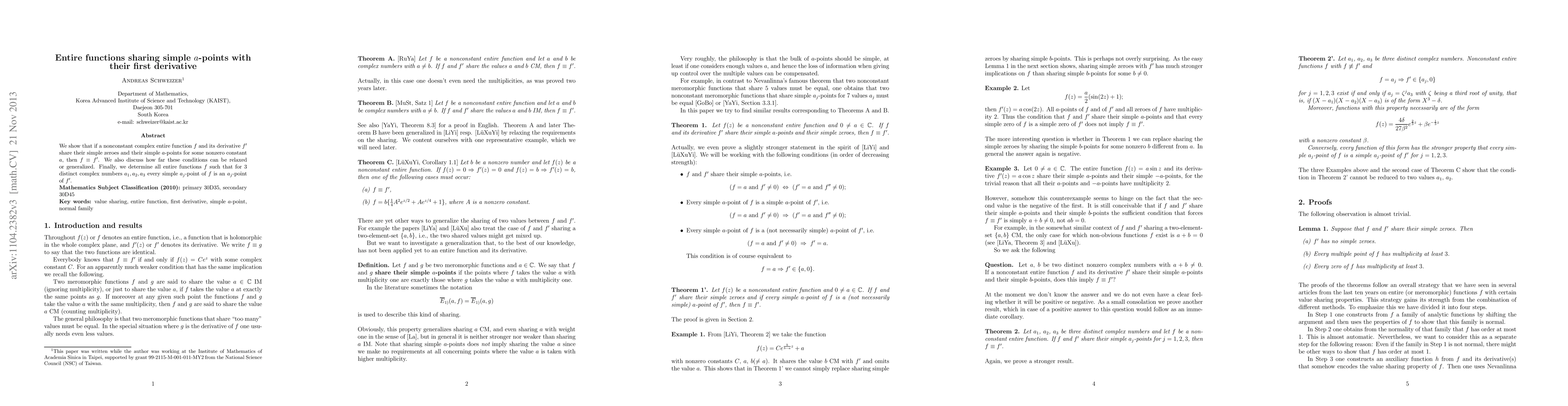 Research shows that complex entire functions sharing simple zeroes and $a$-points with their first derivative are equivalent, while relaxing these conditions may require additional assumptions.