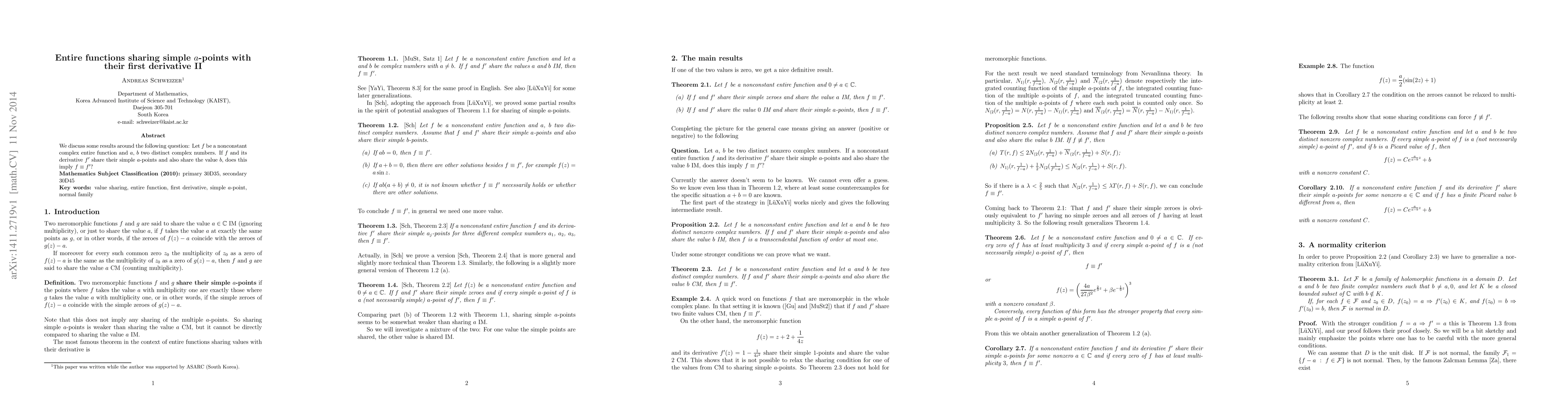 A complex entire function $f$ and its derivative $f'$ share simple $a$-points if they have the same zeros as a point $a$. The paper discusses whether sharing $a$-points and a value $b$ implies that $f$ is equal to its derivative, $f'$. It concludes that this implication does not always hold.