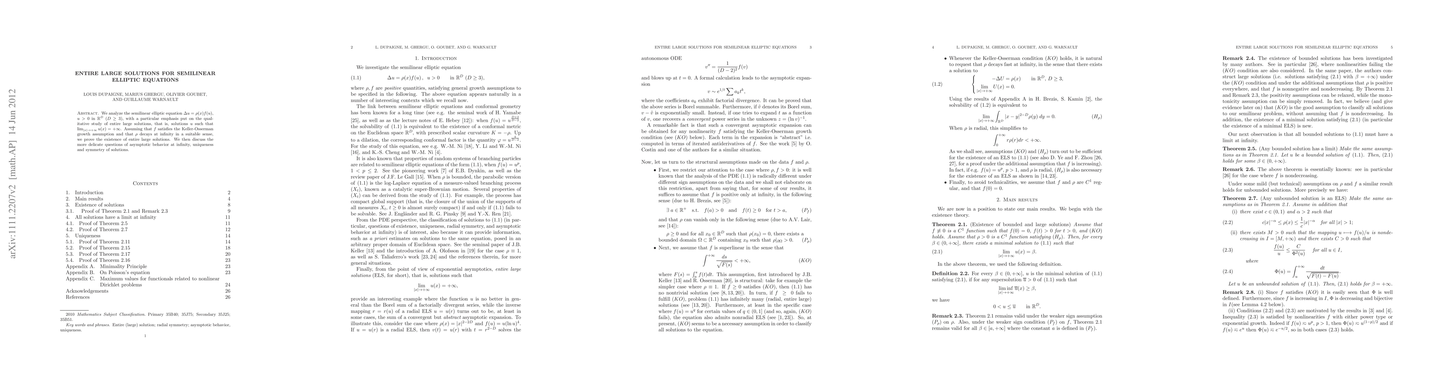 This paper investigates the semilinear elliptic equation $\Delta u=\rho(x) f(u)$ in $\mathbf{R}^D$ $(D\ge3)$, focusing on entire large solutions that tend to infinity as $|x|\rightarrow +\infty$. It proves the existence of such solutions under certain growth and decay conditions, and explores their asymptotic behavior, uniqueness, and symmetry.