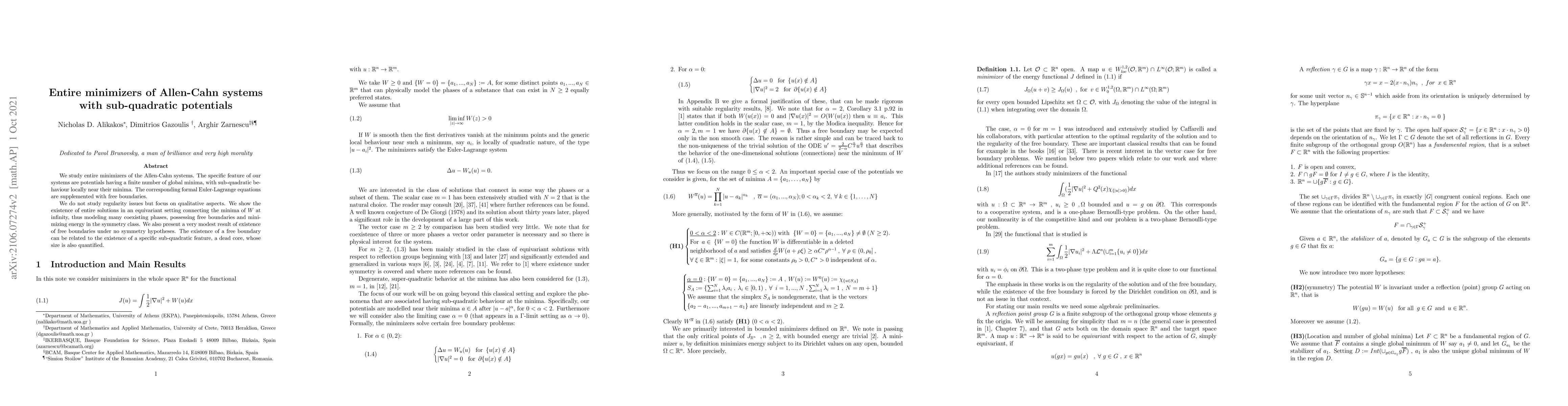 We study entire minimizers of the Allen-Cahn systems. The specific feature of our systems are potentials having a finite number of global minima, with sub-quadratic behaviour locally near their minima. The corresponding formal Euler-Lagrange equations are supplemented with free boundaries. We do not study regularity issues but focus on qualitative aspects. We show the existence of entire solutions in an equivariant setting connecting the minima of $ W $ at infinity, thus modeling many coexisting phases, possessing free boundaries and minimizing energy in the symmetry class. We also present a very modest result of existence of free boundaries under no symmetry hypotheses. The existence of a free boundary can be related to the existence of a specific sub-quadratic feature, a dead core, whose size is also quantified.