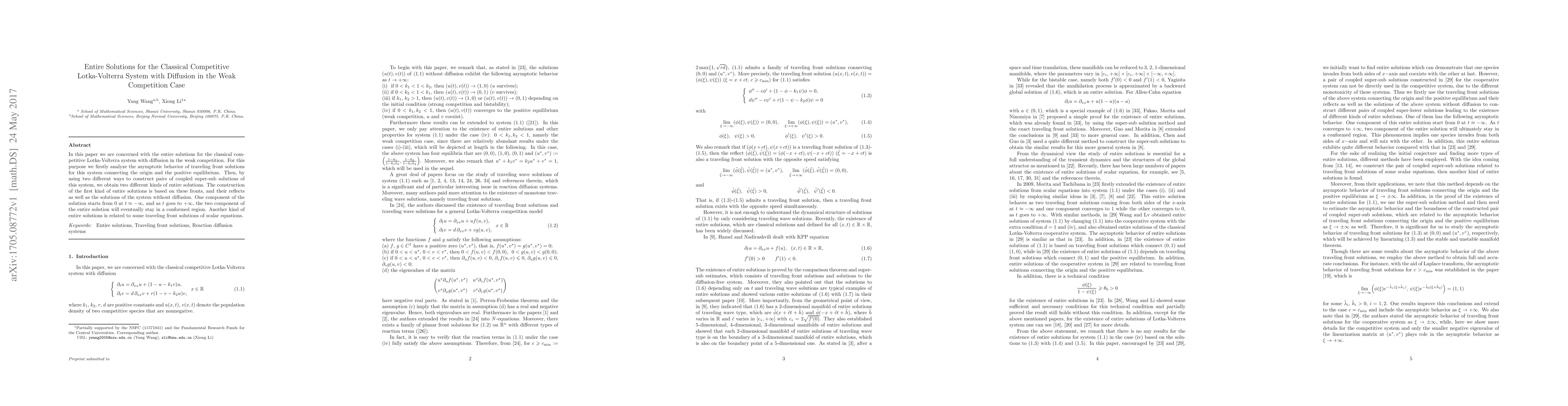 This paper explores entire solutions for the competitive Lotka-Volterra system with diffusion under weak competition. It constructs two types of entire solutions by analyzing traveling fronts and employing super-sub solution pairs, leading to solutions that converge to a stable region as time progresses.