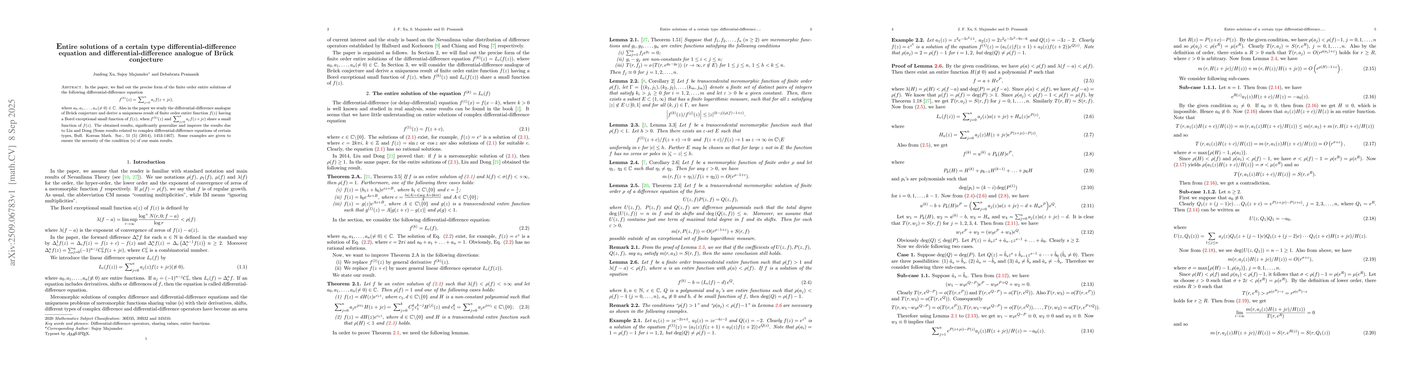 In the paper, we find out the precise form of the finite order entire solutions of the following differential-difference equation \[f^{(k)}(z)=\sideset{}{^n_{j=0}}{\sum} a_j f(z+jc),\] where $a_0, a_1,\ldots,a_n(\neq 0)\in\mathbb{C}$. Also in the paper we study the differential-difference analogue of Br\"{u}ck conjecture and derive a uniqueness result of finite order entire function $f(z)$ having a Borel exceptional small function of $f(z)$, when $f^{(k)}(z)$ and $\sideset{}{^n_{j=0}}{\sum} a_j f(z+jc)$ share a small function of $f(z)$. The obtained results, significantly generalize and improve the results due to Liu and Dong (Some results related to complex differential-difference equations of certain types, Bull. Korean Math. Soc., 51 (5) (2014), 1453-1467). Some examples are given to ensure the necessity of the condition (s) of our main results.