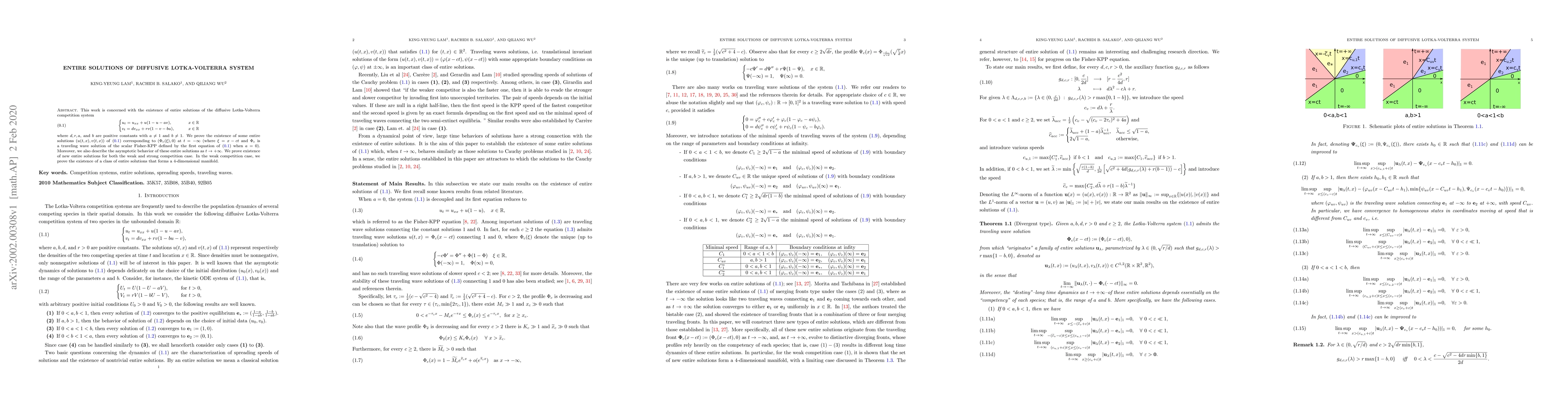 This work is concerned with the existence of entire solutions of the diffusive Lotka-Volterra competition system \begin{equation}\label{eq:abstract} \begin{cases} u_{t}= u_{xx} + u(1-u-av), & \qquad \ x\in\mathbb{R} \cr v_{t}= d v_{xx}+ rv(1-v-bu), & \qquad \ x\in\mathbb{R} \end{cases} \quad (1) \end{equation} where $d,r,a$, and $b$ are positive constants with $a\neq 1$ and $b\neq 1$. We prove the existence of some entire solutions $(u(t,x),v(t,x))$ of $(1)$ corresponding to $(\Phi_{c}(\xi),0)$ at $t=-\infty$ (where $\xi=x-ct$ and $\Phi_c$ is a traveling wave solution of the scalar Fisher-KPP defined by the first equation of $(1)$ when $a=0$). Moreover, we also describe the asymptotic behavior of these entire solutions as $t\to+\infty$. We prove existence of new entire solutions for both the weak and strong competition case. In the weak competition case, we prove the existence of a class of entire solutions that forms a 4-dimensional manifold.